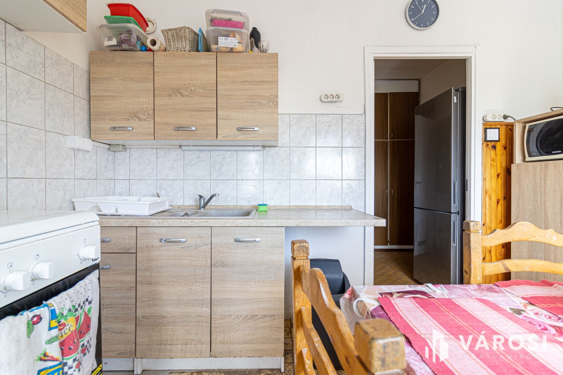 Előszoba, konyha linóleummal ellátott.