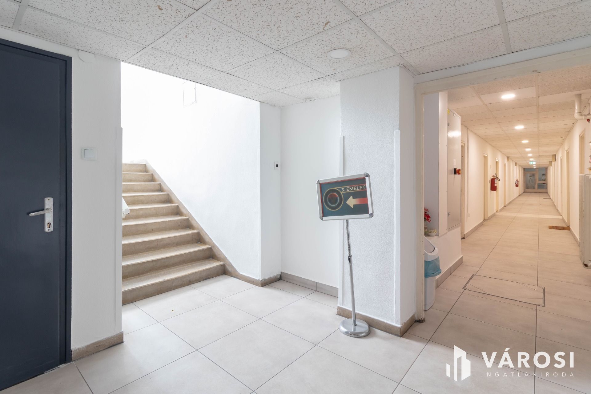 A 16 m2-es iroda az irodaház 1. emeletén helyezkedik el. A helyiség laminált padlóval burkolt.