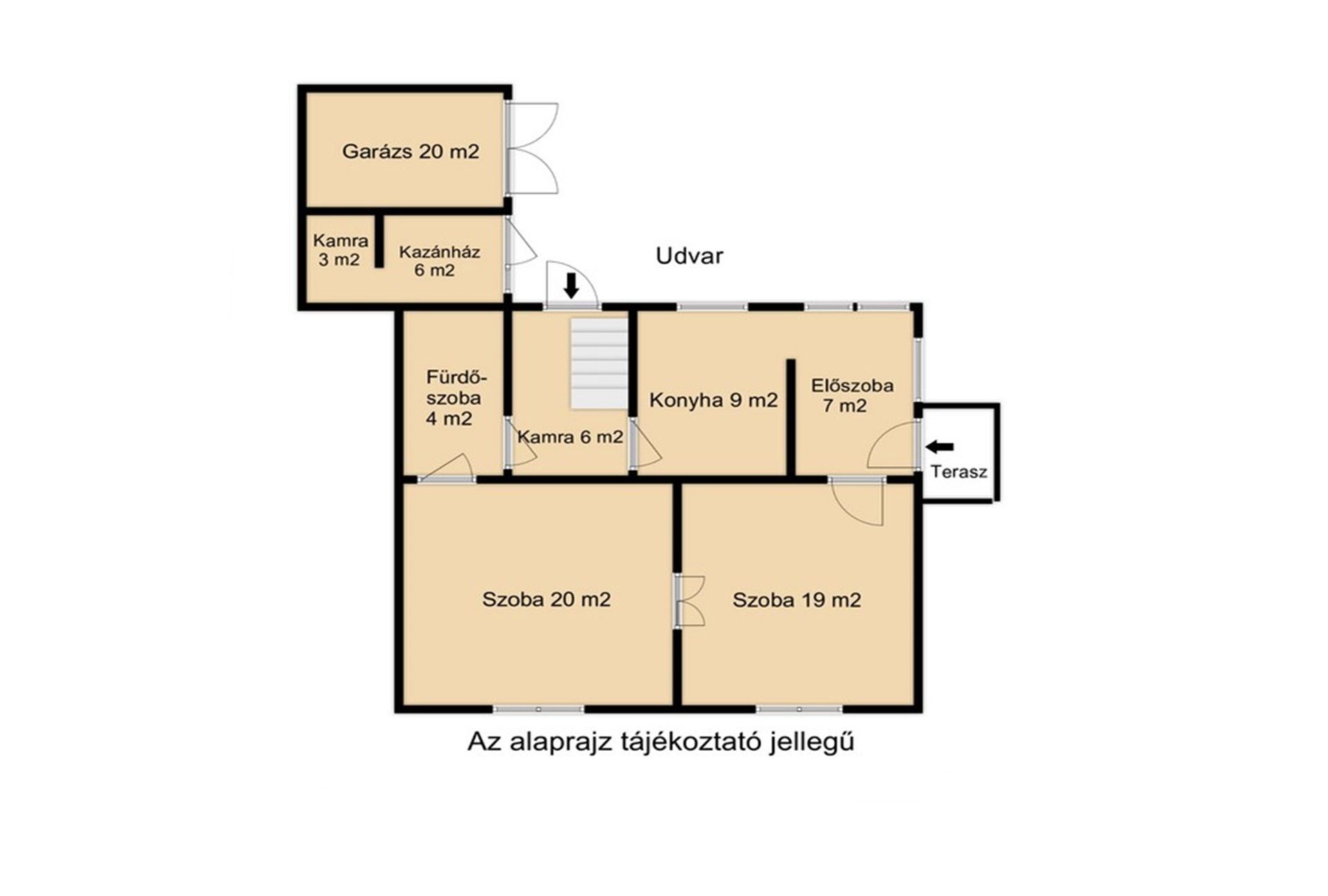 A lakótér kettő nagy szobából, konyhából, kamrából, fürdőszobából és egy kis előszobából áll. A melléképület, amely a ház közvetlen folytatása egy külön bejáratú kazánháznak és kamrának ad helyet, valamint egy 20 m2-es garázsnak, amelyek beton födémmel rendelkeznek. Így a lakórész akár még ebbe az irányba is bővíthető.