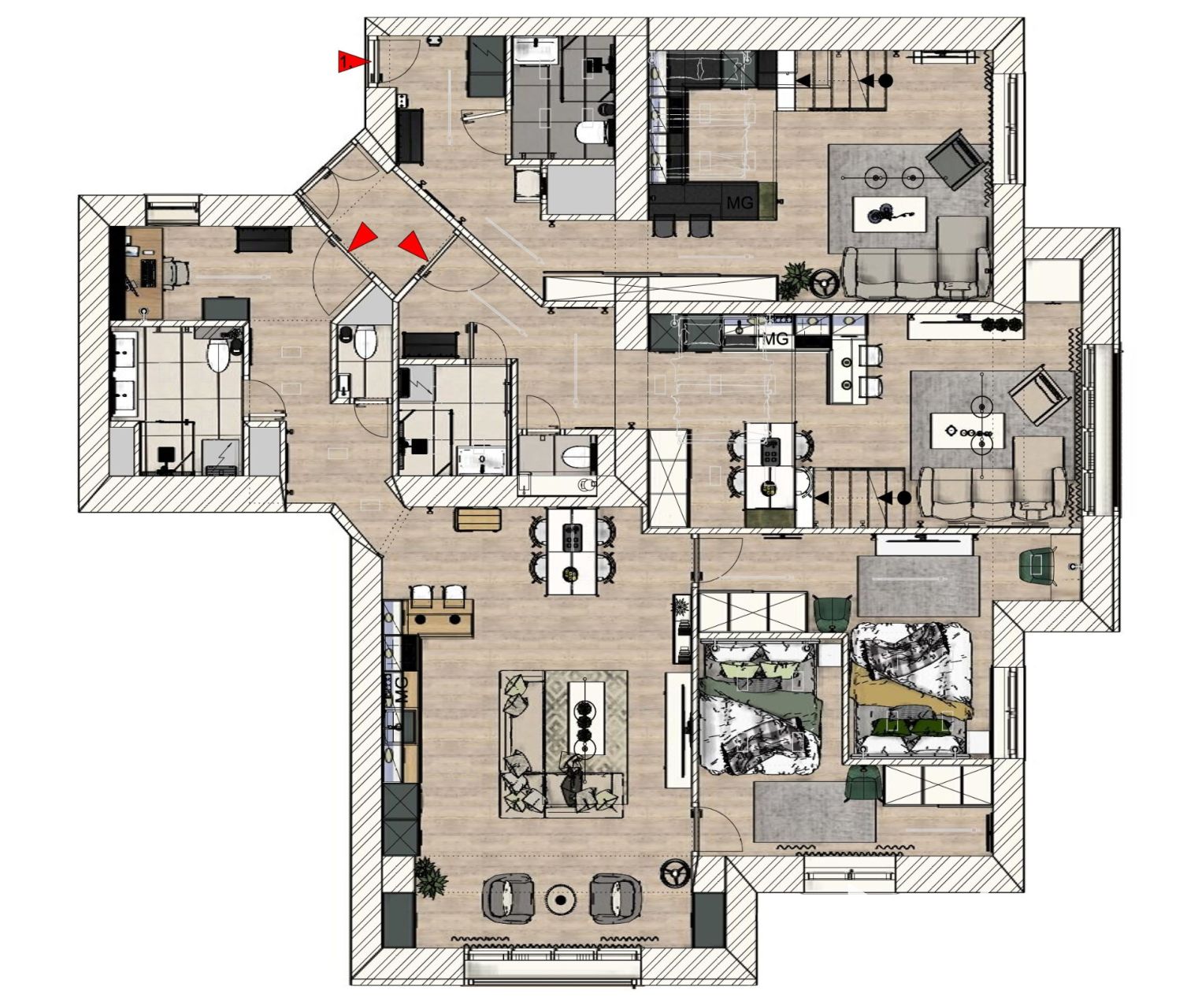 The property is situated on the 1st floor of a well-maintained, 6-story residential building. The interior spaces were designed by an interior designer, featuring premium materials and modern smart home solutions, ensuring high comfort and long-lasting quality.