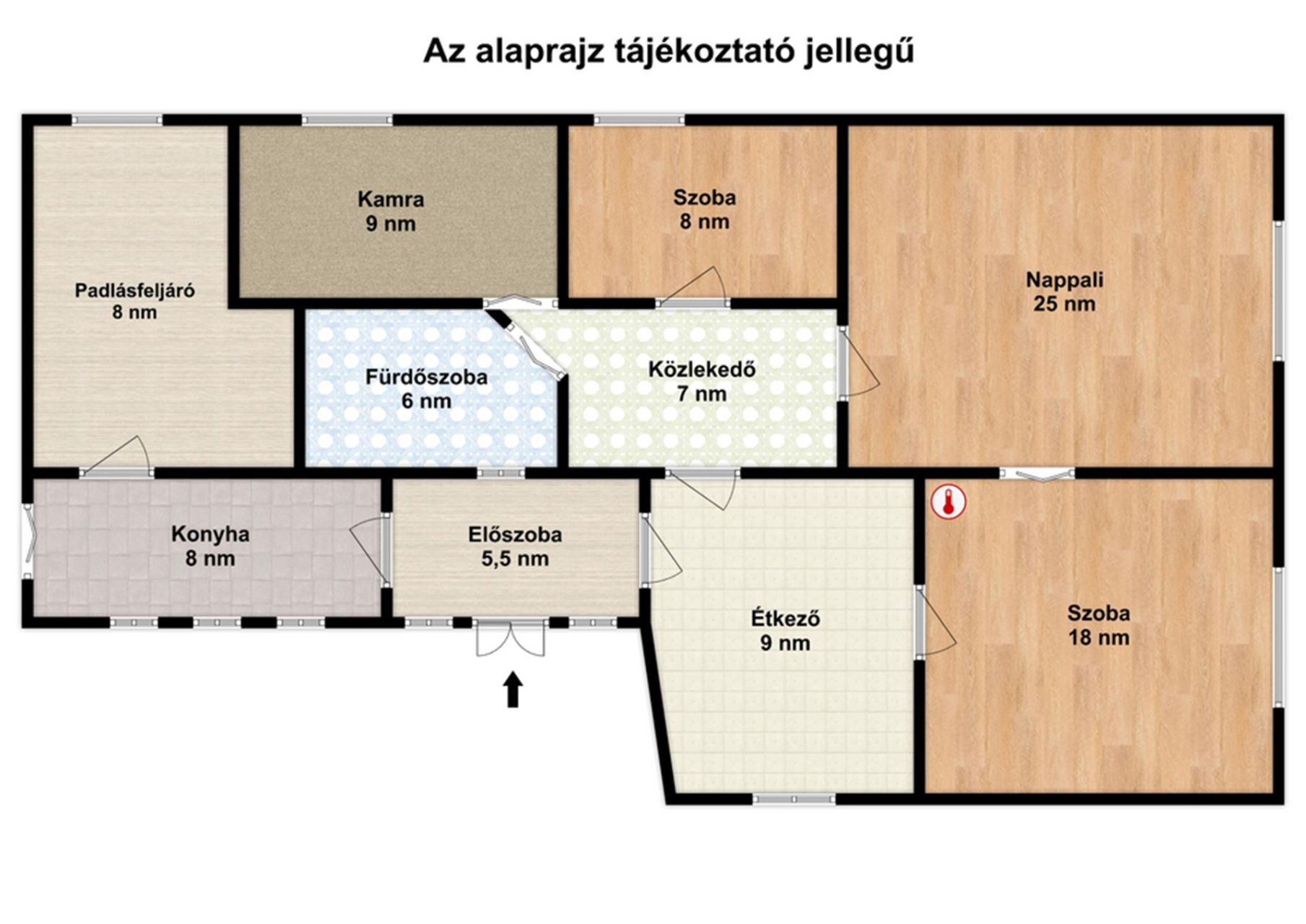 A ház jelenlegi elosztása: nappali, két hálószoba, étkező, konyha, kamra, fürdőszoba, de könnyedén kialakítható benne egy harmadik hálószoba is. A falazata vegyes, tégla alappal rendelkezik. A tető javítása jelenleg is folyamatban van, a cserépcsúszások okozta beázások megszüntetését a jelenlegi tulajdonos vállalja. Az ingatlan rendelkezik: vezetékes ivóvízzel, városi csatornával, gázórával (szolgáltatás szünetel), de jelenleg a villany nincs bekötve, új óra igénylése szükséges.