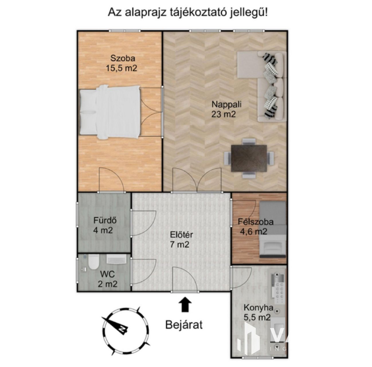 Elrendezése nappali + szoba + félszoba + fürdő + wc + előtér + konyha