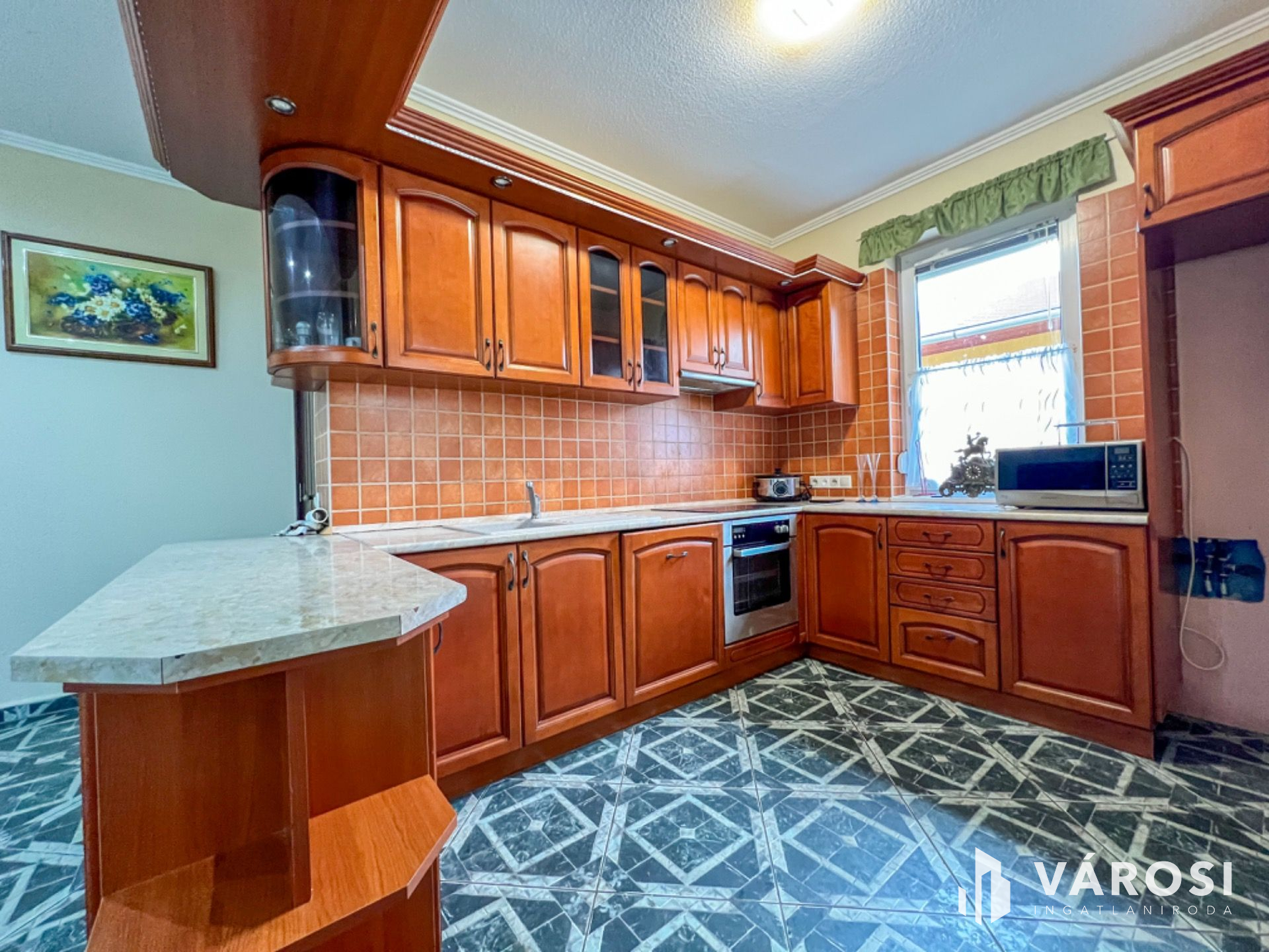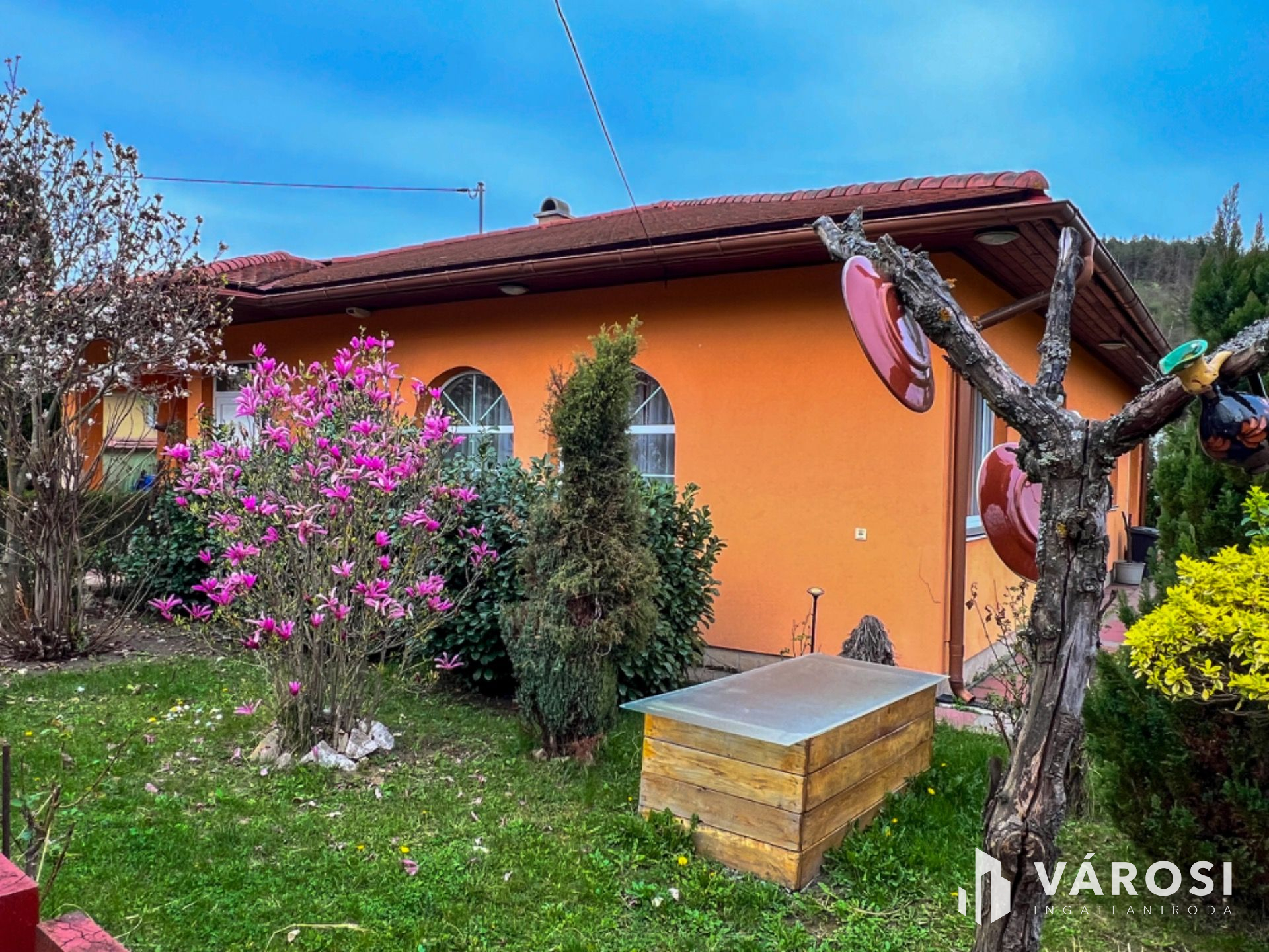 Az ingatlanhoz tartozó telek cca. 300 nm nagyságú, körbekerített, udvari gépkocsi beálló, nyitott terasz, kerti tároló, kemence, fúrt kút, tuják, gyümölcsfák találhatók.