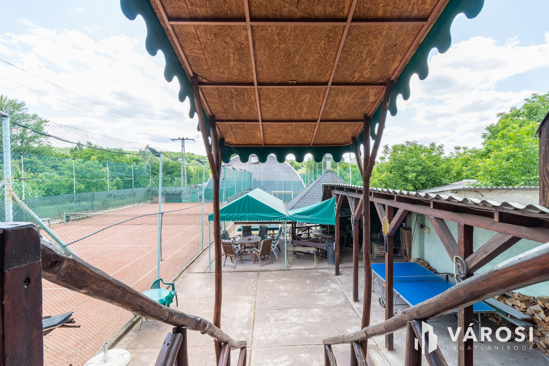 Az ingatlanon található egy két szintes, tégla építésű épület, amely eredetileg az 1960-as években épült, majd 2000-ben teljes felújításon esett át, és elnyerte jelenlegi formáját. Az alsó szinten egy 39 m2-es területen helyezkedik el egy iroda és öltözők. Itt találhatók fürdőszobák zuhanyzóval és mosdóval, biztosítva a megfelelő komfortot a vendégeknek és a sportolóknak. A felső szint 91 m2-es területen helyezkedik el, és egy kocsma került kialakításra. Ez a tér tökéletes helyszín lehet a pihenésre és a társaság élvezetére az edzések vagy sportesemények után.