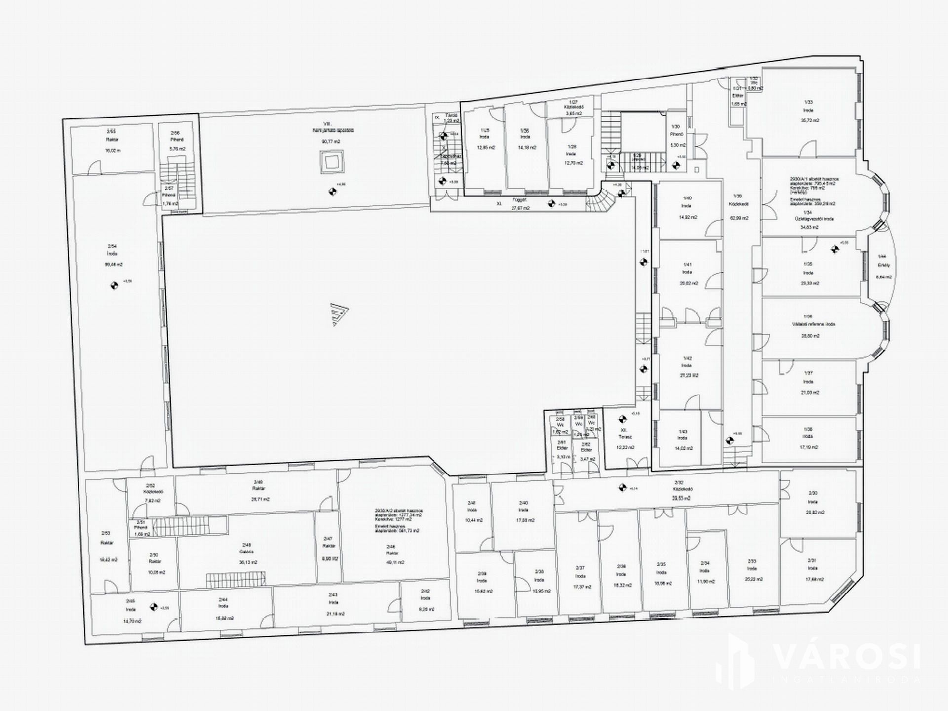 Társasházi alapító okirattal, 2 HRSZ-szel rendelkezik, a tulajdoni lapon irodaépületként szerepel.