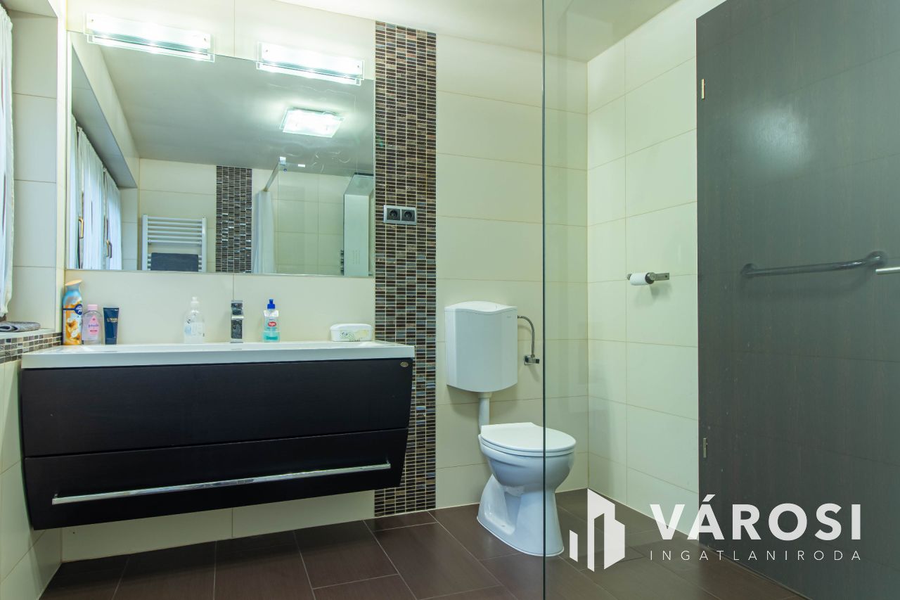 A 2007-ben teljeskörűen átépített és átalakított családi ház 179 m²-es, amelyhez egy 28 m²-es garázs is tartozik. Az alsó szinten egy tágas előtér, egy világos, egybenyitott nappali-konyha-étkező, egy hálószoba és egy fürdőszoba található. Az ingatlan ezen a szinten padlófűtéssel rendelkezik, valamint két hűtő-fűtő klíma biztosítja a megfelelő hőmérsékletet. Az emeleten négy hálószoba kapott helyet, melyek közül az egyik közel 40 m²-es, így akár ketté is osztható. Két szoba teraszkapcsolatos, a folyosón beépített szekrény, valamint egy további fürdőszoba található. Az emeleti helyiségek radiátoros fűtéssel és három hűtő-fűtő klímával vannak ellátva. A ház minden részlete a minőséget és a modern kényelmet tükrözi, a vízhálózat vízlágyítóval van felszerelve, az udvarban pedig egy fűtött, vízforgatós medence biztosítja a kikapcsolódás lehetőségét.
