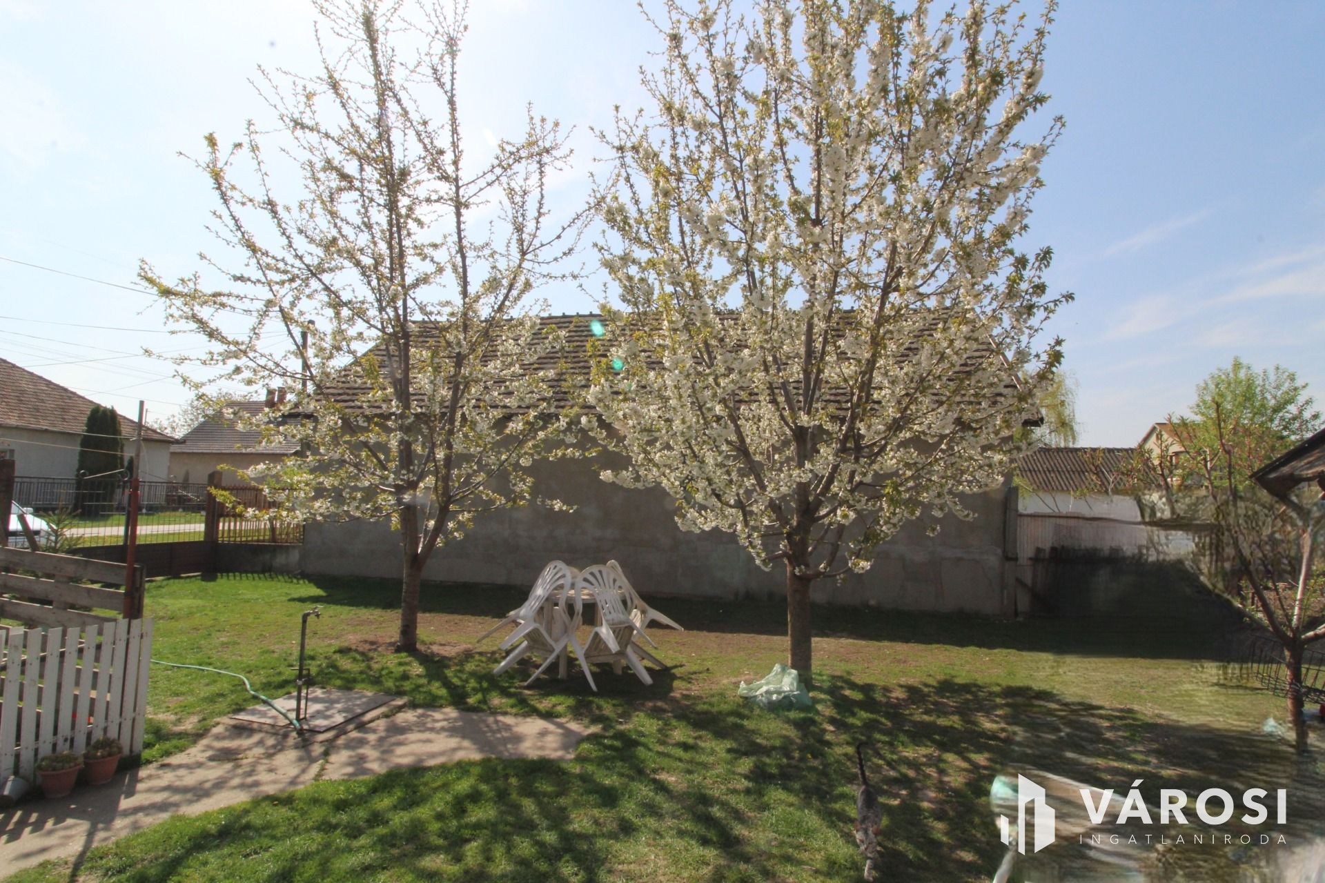 Az udvaron, garázs, ólak, tárolók találhatók, és a telek hátsó része megművelt kert gyümölcsfákkal.