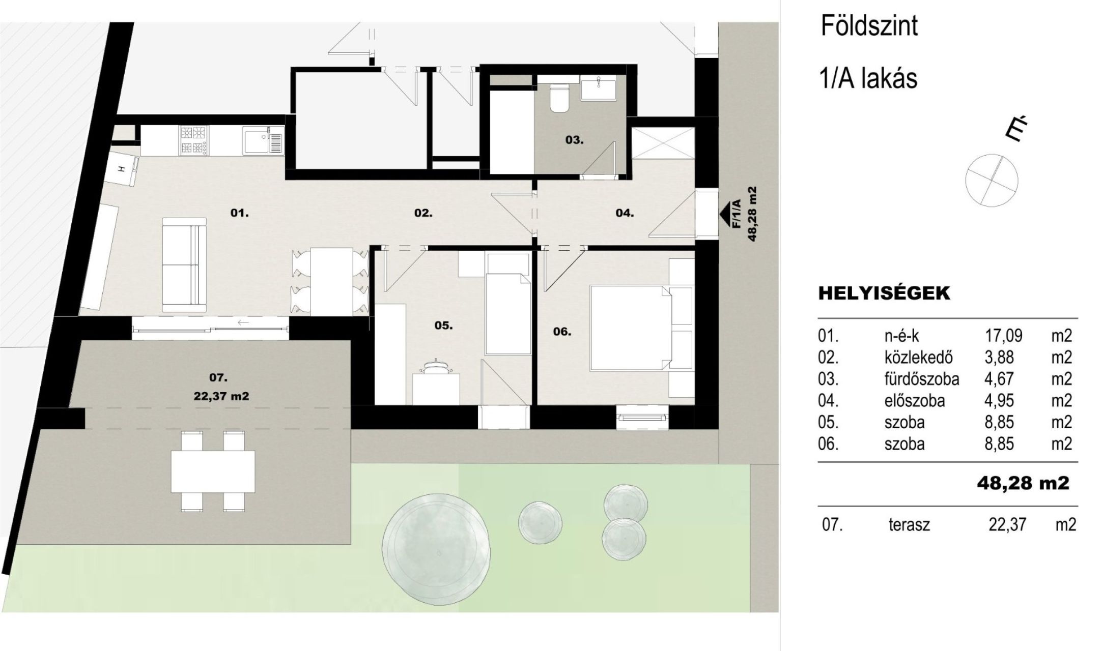 A lakáshoz tartozik egy hangulatos 22 nm-es nagy terasz, és egy kis kertrész, melyek ideálisak a pihenésre vagy baráti összejövetelekre. A kertvilágítás este is kellemes hangulatot biztosít.