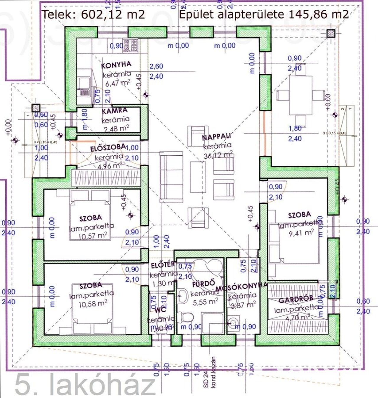 - a falazat Porotherm 30 N+F téglából készül, 15 cm-es külső és 12 cm-es lábazati szigeteléssel ellátva