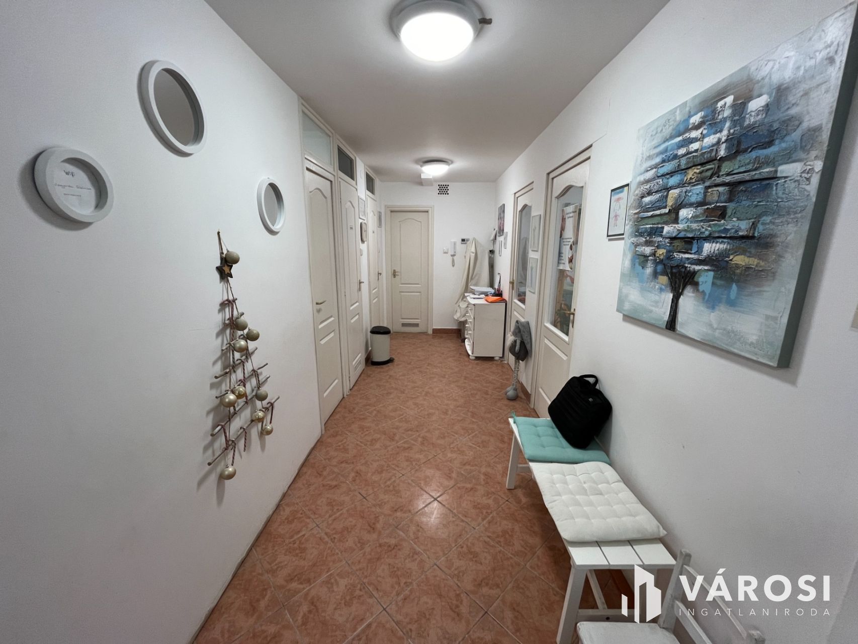 A helyiség praktikus elrendezéssel rendelkezik, három kezelőhelyiséggel, váróval, három mosdóval, teakonyhával minden igényt kielégít.