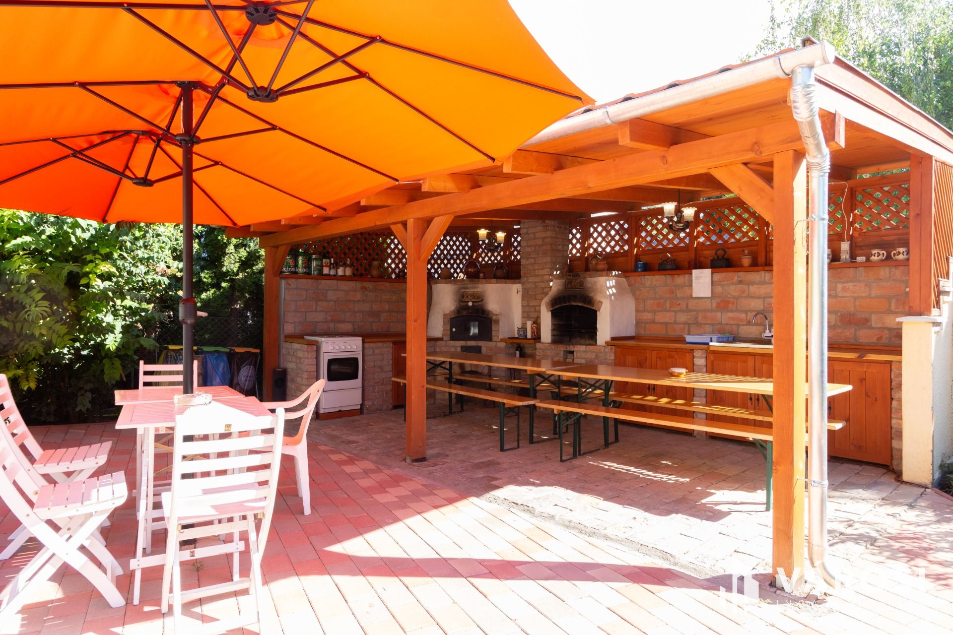 A telek mérete 911 m2 amin ezen felül található fűthető kerti medence, kerti konyha, kemence és bográcsozó, fúrt kút, tároló és akár 5-6 személygépjárműnek parkolási lehetőség.