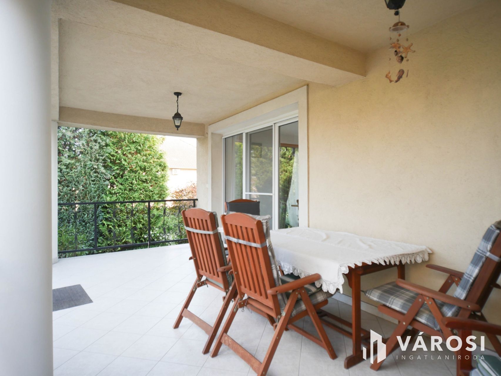 Az ingatlan megjelenése rendezett és igényes már az érkezés pillanatában: falazott alapokon álló kovácsoltvas kerítés és motoros tolókapu biztosítja a kényelmes és biztonságos bejutást, míg a zárt udvar teljes intimitást nyújt. A kert gondosan kialakított, füvesített, örökzöldekkel és sövénnyel beültetett, így a privát szféra maximálisan adott.