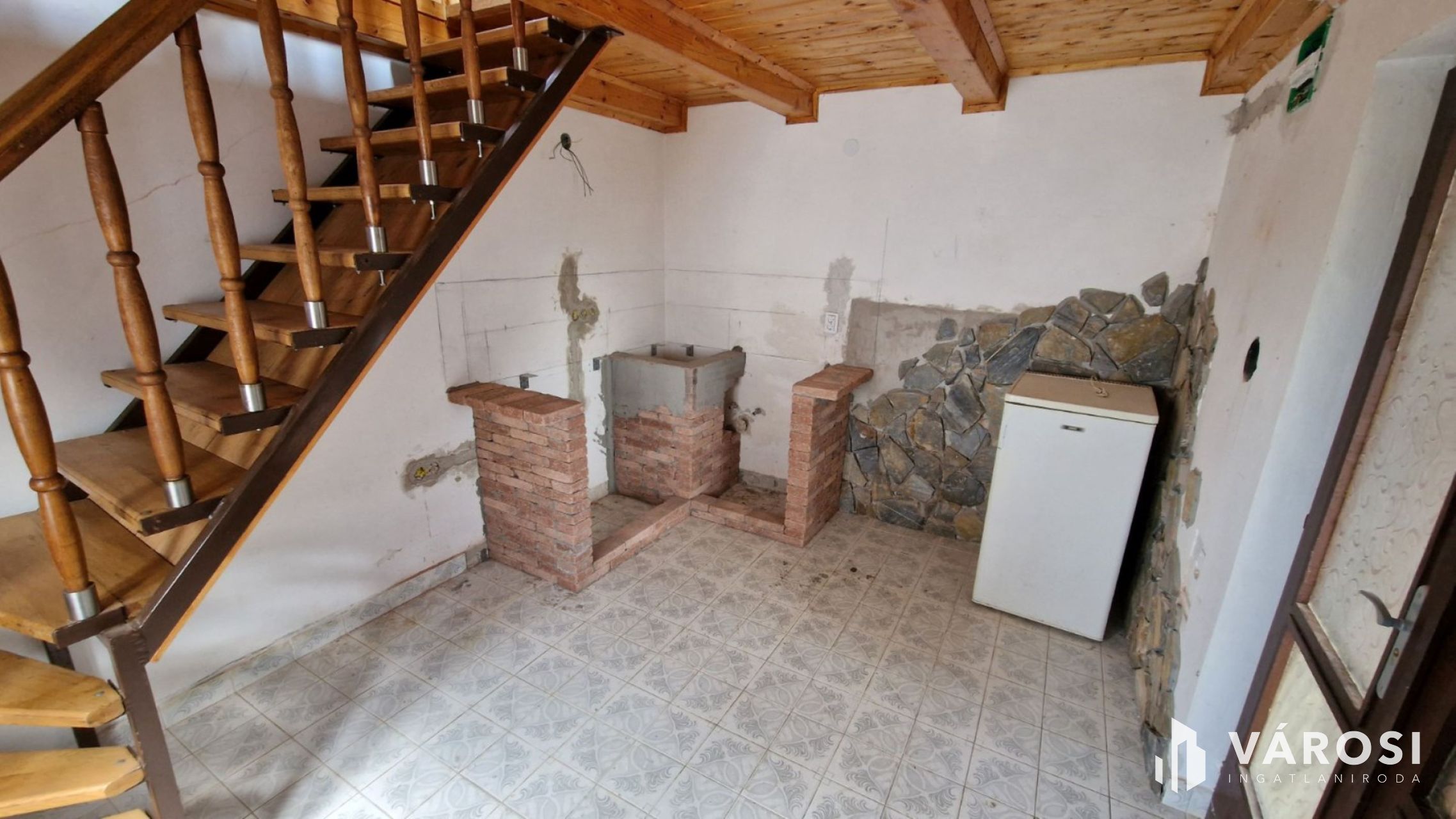 Az alsó szinten konyha és étkező került kialakításra, külön helyiségben a zuhanyzó és wc (teraszon keresztül megközelíthető), a felső szinten egy nagy szoba került kialakításra, mely egy fa lépcső segítségével megközelíthető.