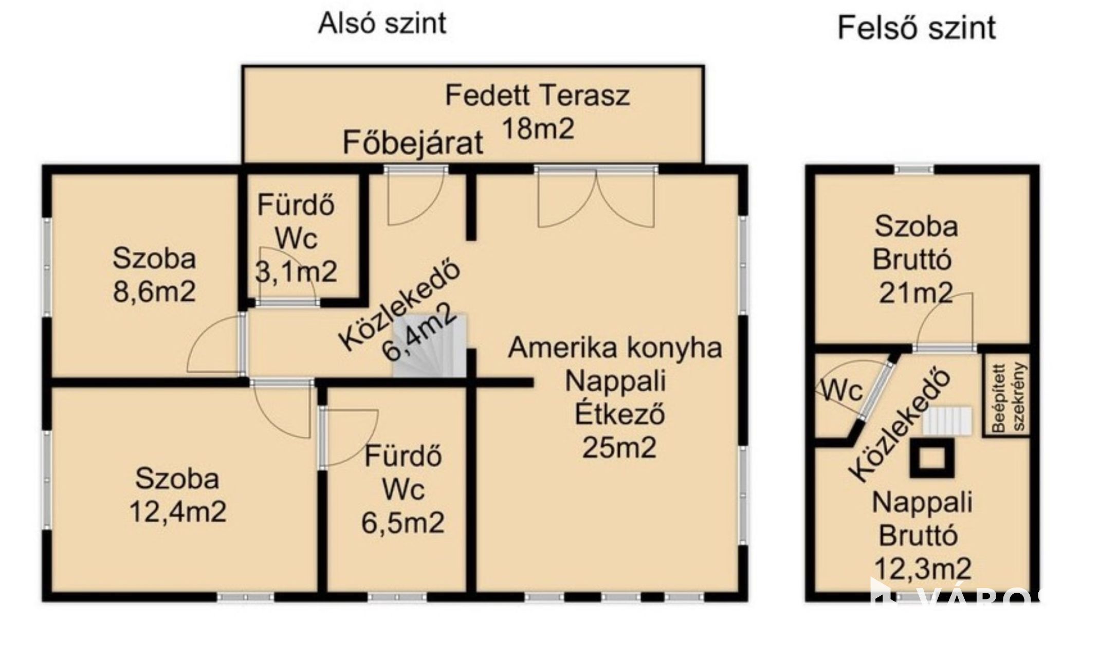 A családi ház alsó szintjén kialakításra került 2 külön bejáratú szoba, melyek közül az egyikhez saját fürdőszoba is tartozik, egy közlekedő, fürdő mellékhelységgel együtt, amerikai konyha nappali étkező közvetlen teraszkapcsolattal. Felső szinten található egy nagy szoba, egy nappali, és egy mellékhelység.