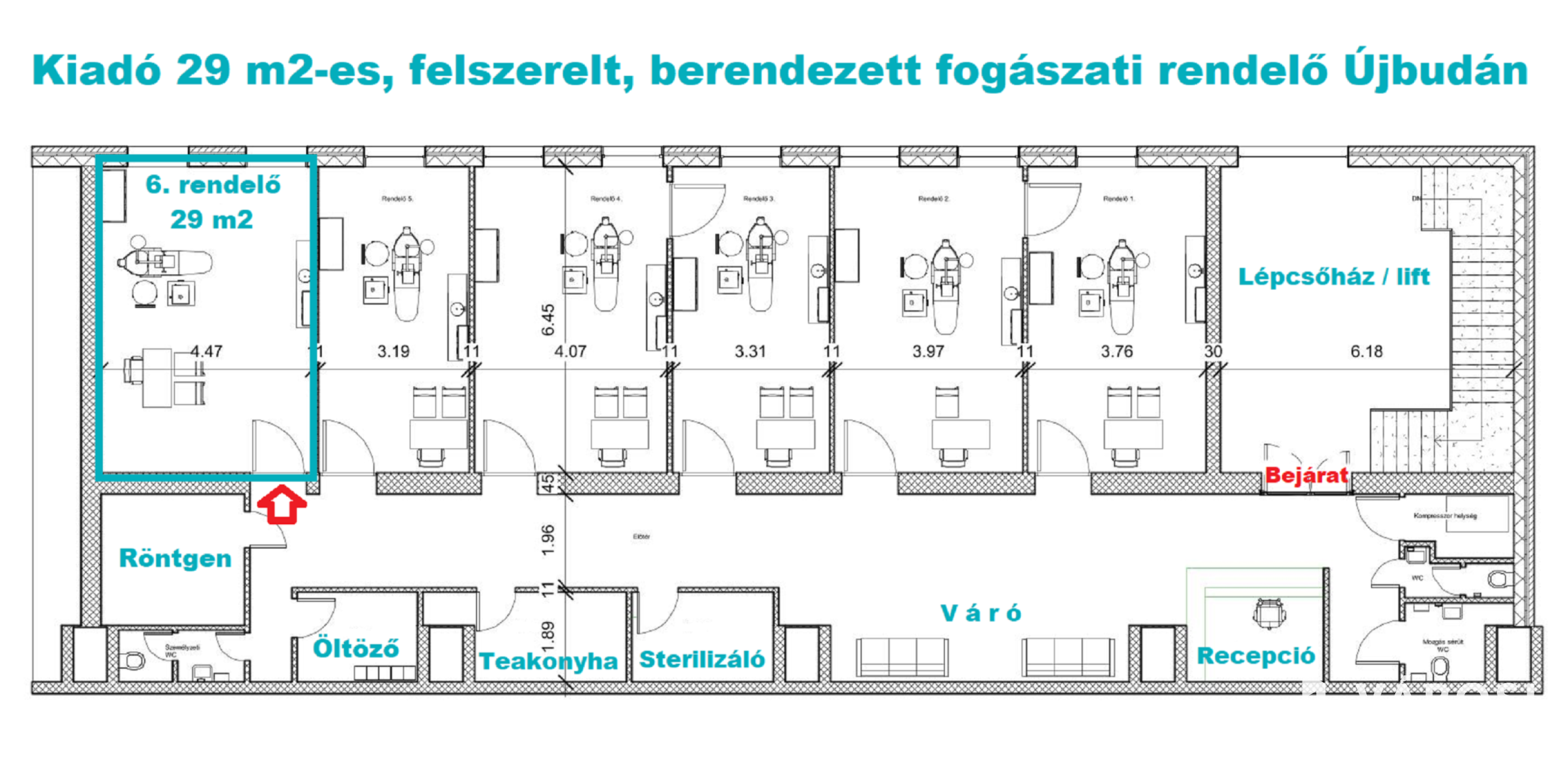 A komplexumban egymás mellett 6 rendelő kiadó, ez a rendelő 29 m2 alapterületű, teljesen felszerelt, Optimal 09 kezelőegységgel, fogászati eszközökkel és rendelői bútorzattal ellátott.