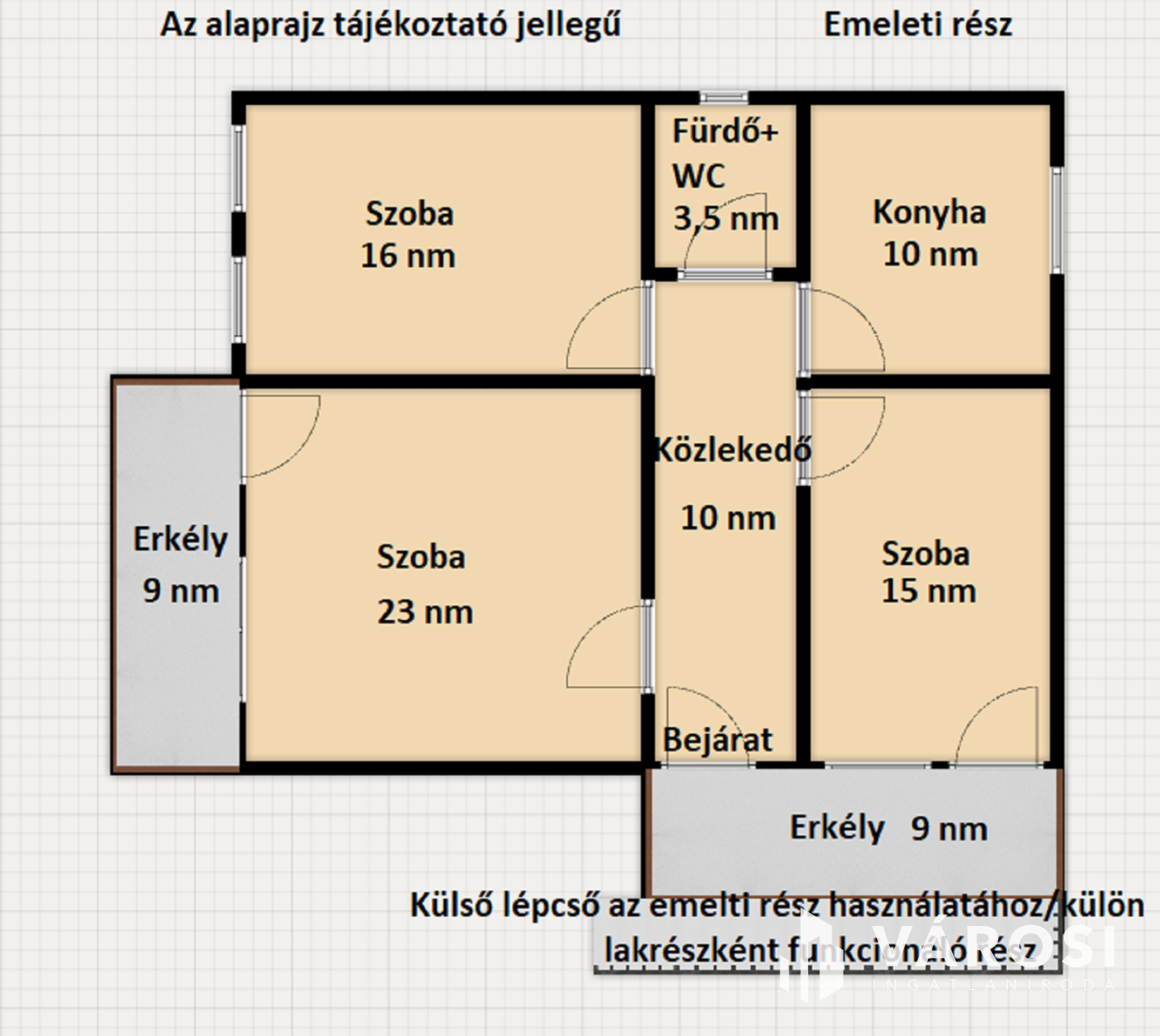 Az ingatlan emeleti része lakható, átlagos állapotú. A nyílászárók majdnem mindenhol ki lettek cserélve. Viszont a gépészet itt még a régi, tehát a villany és a víz vezetékek cseréje ajánlott, bár minden működik most is.