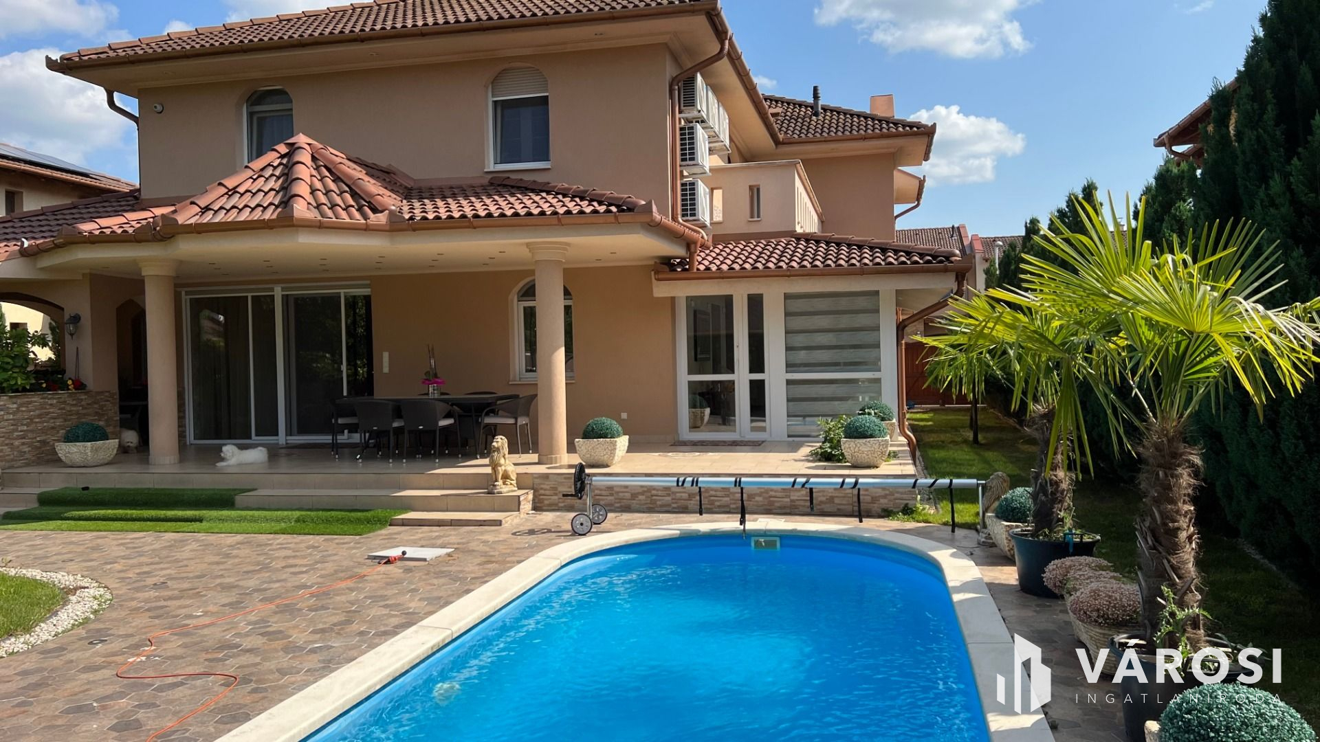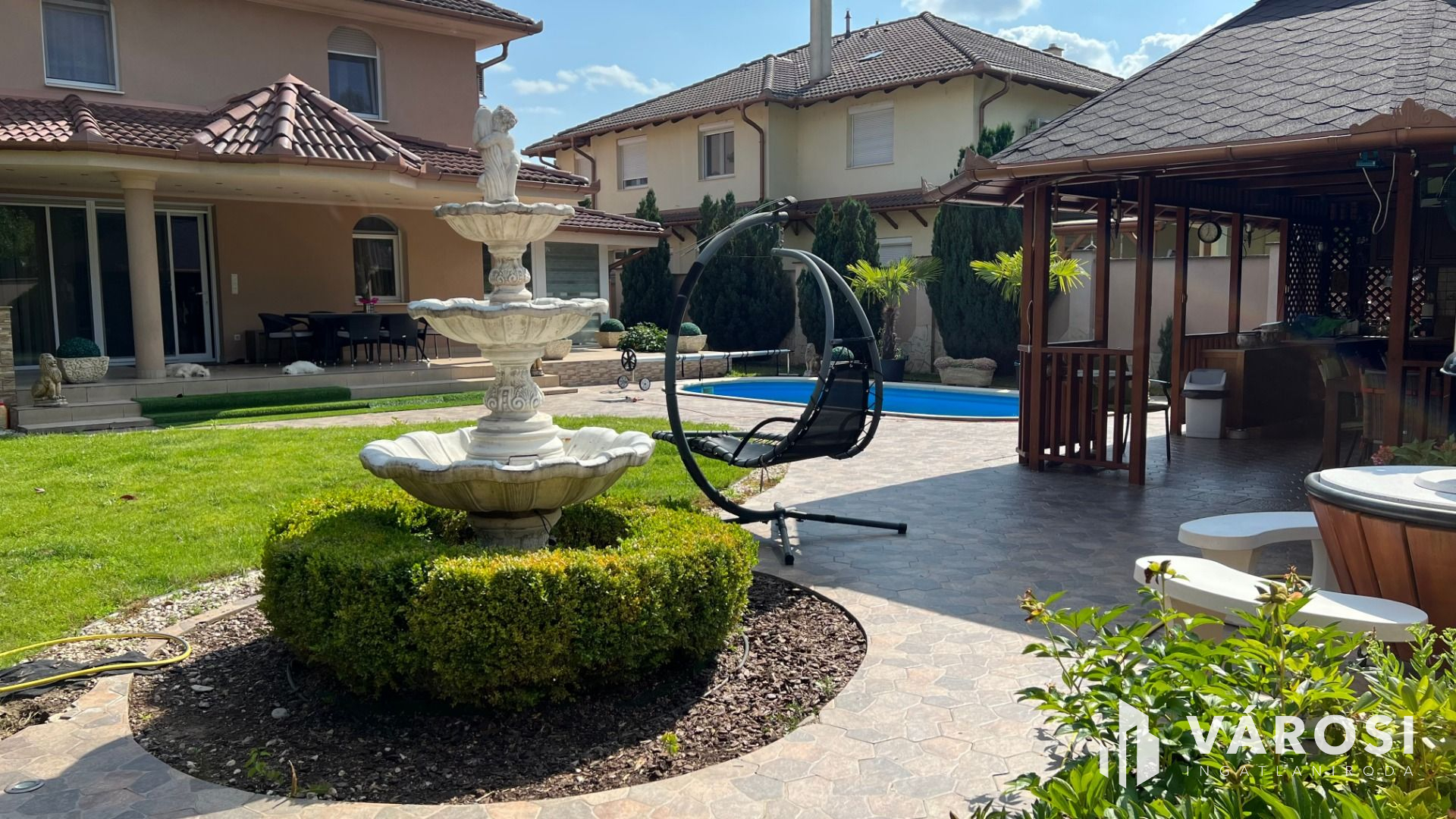 A 332 square meters independent luxury property for sale in Liget residential park, a prominent part of Debrecen. The lower level of the house has a living room, dining room, kitchen, an entrance hall, and a toilet. Naturally, there is also a large double garage and a terrace on the ground floor. On the upper level, there is a large space from which you can reach the three bedrooms and the two large bathrooms. The upper level also has a wardrobe, laundry and kitchen, and each bedroom has a terrace. The lot is large, 760 square meters, plus another lot of similar size is fenced off at the back. The garden is beautifully landscaped, and there is also a beautiful terrace equipped with everything. A heated swimming pool in front of the terrace provides residents with a pleasant feeling of luxury at home. The house has a high technical content and is equipped with all extras, fully furnished. Located in the most elite part of Debrecen, surrounded by high-end, beautiful properties.