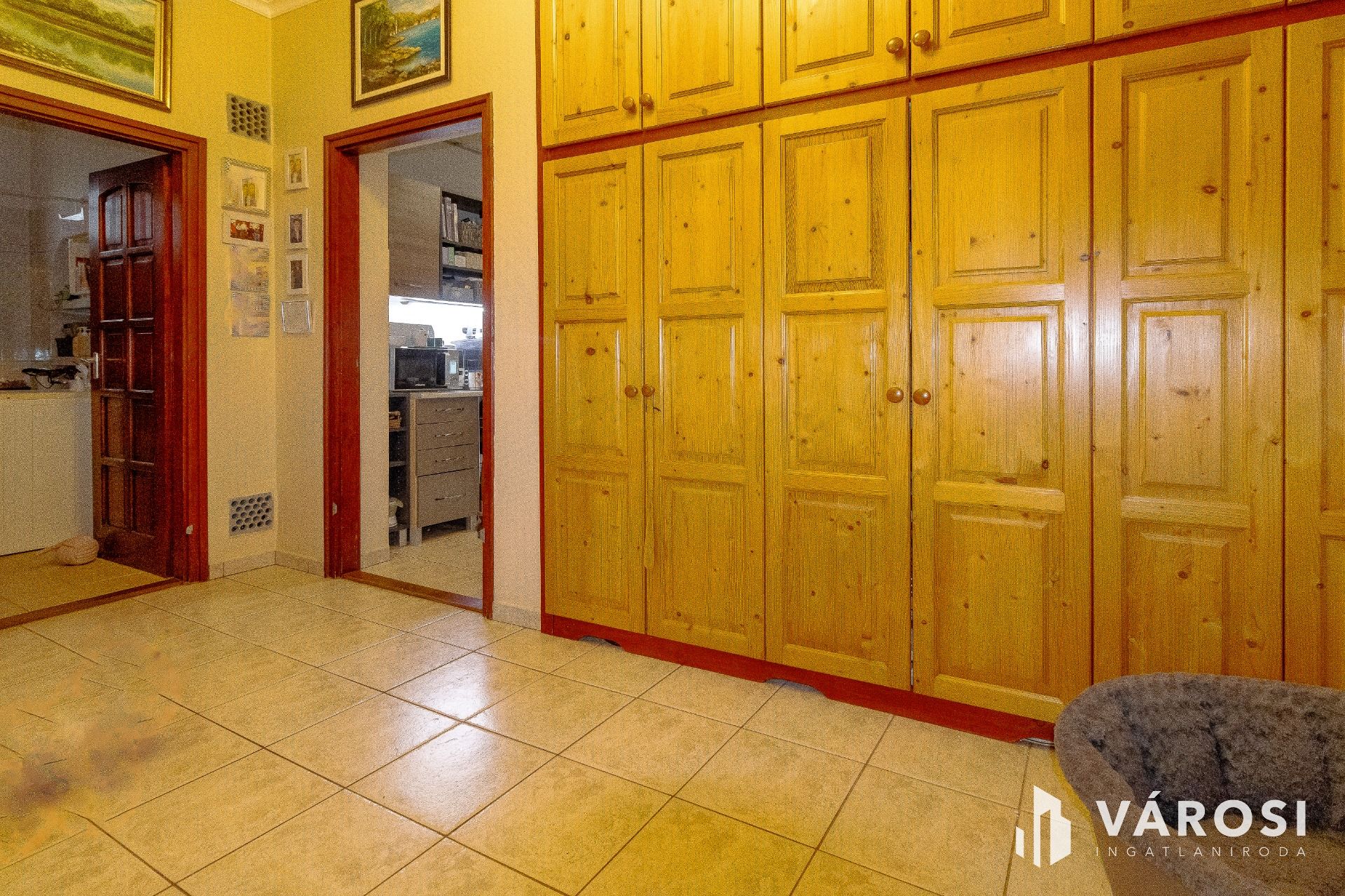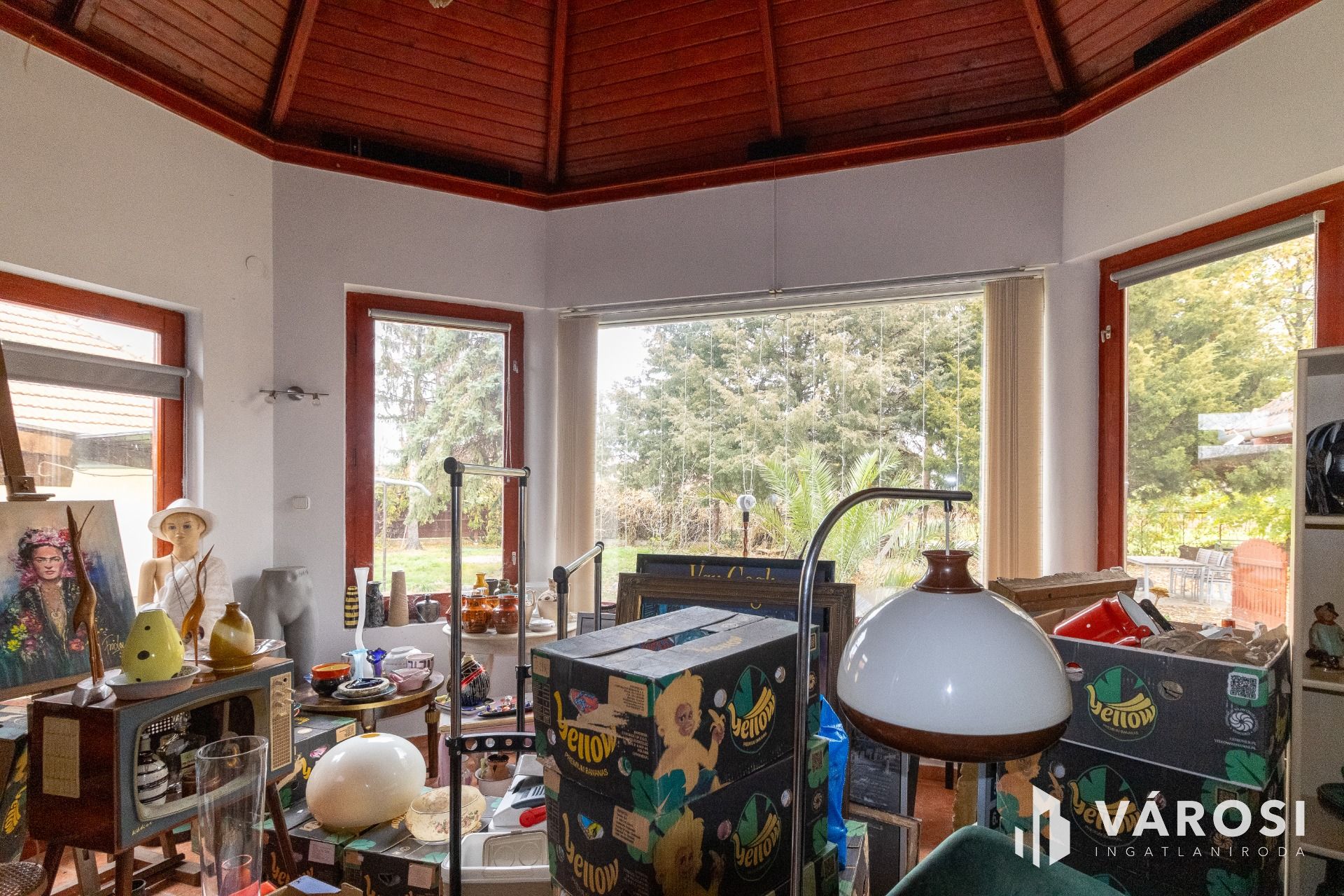 A helyiségek: előszobából két, méretes szoba nyílik, egy kádas fürdő, és a konyha-étkező. Innen érhetőek el a további helyiségek - az egyik irányban egy tusolós fürdő, és a kertre néző nappali, a másik irányban a kamra és egy jelenleg irodaként használt helyiség található.