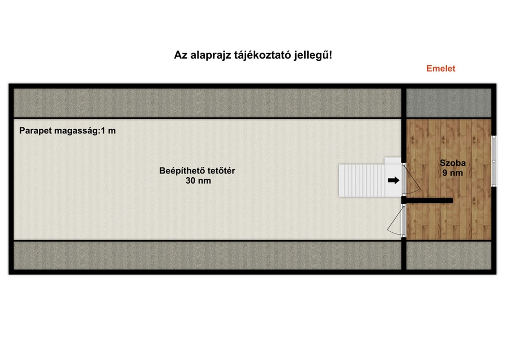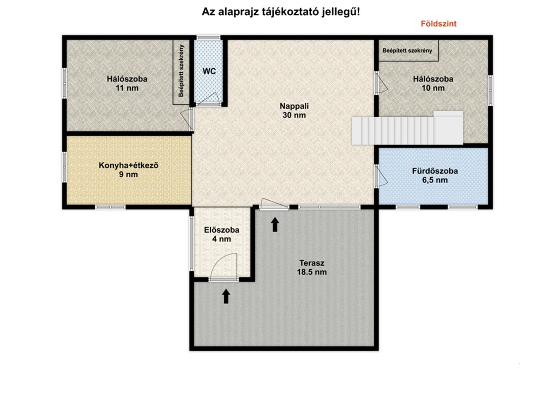 Az ingatlan belső elrendezése kiváló, a földszinten: egy tágas nappali, kettő hálószoba, konyha+étkező, fürdőszoba és külön mellékhelyiség áll rendelkezésre. A komfortot egy modern amerikai konyha és étkező biztosítja. Emeleten, jelenleg egy hálószoba lett kialakítva, de további bővítési lehetőségeket kínál egy 30 m²-es beépíthető padlástéren keresztül. A pihenéshez és kikapcsolódáshoz egy 18,5 m²-es terasz áll rendelkezésre, amely tökéletes helyszíne lehet a kerti összejöveteleknek vagy egy nyugodt reggeli kávézásnak.