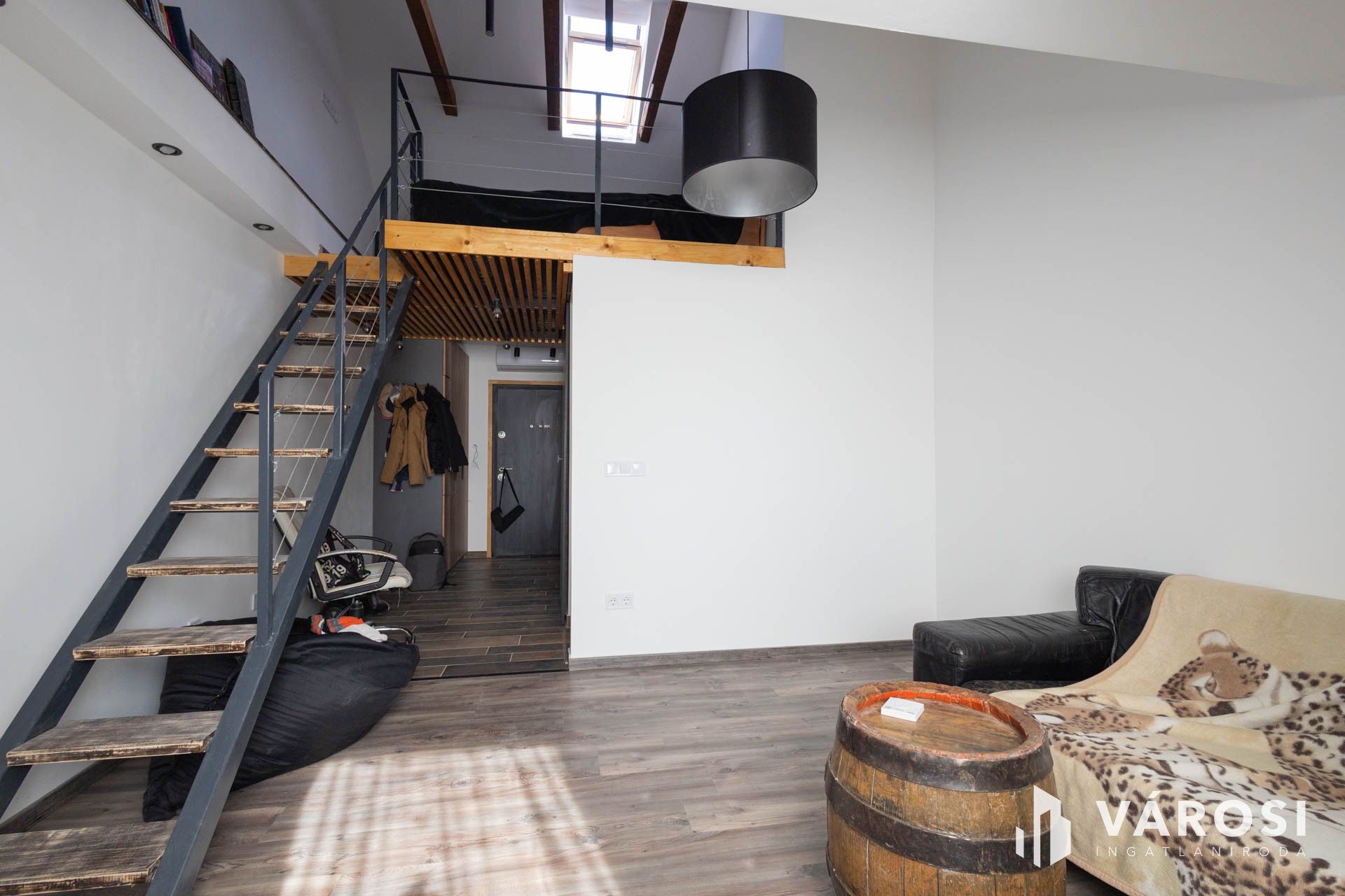Eladó Móraváros elején a Nemestakács utcában egy 4. emeleti egy szobás, galériázott fiatalos lakás.