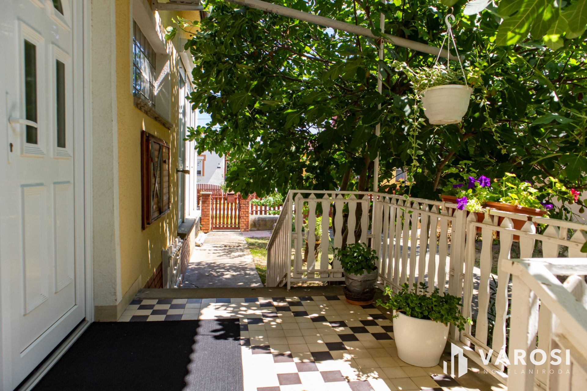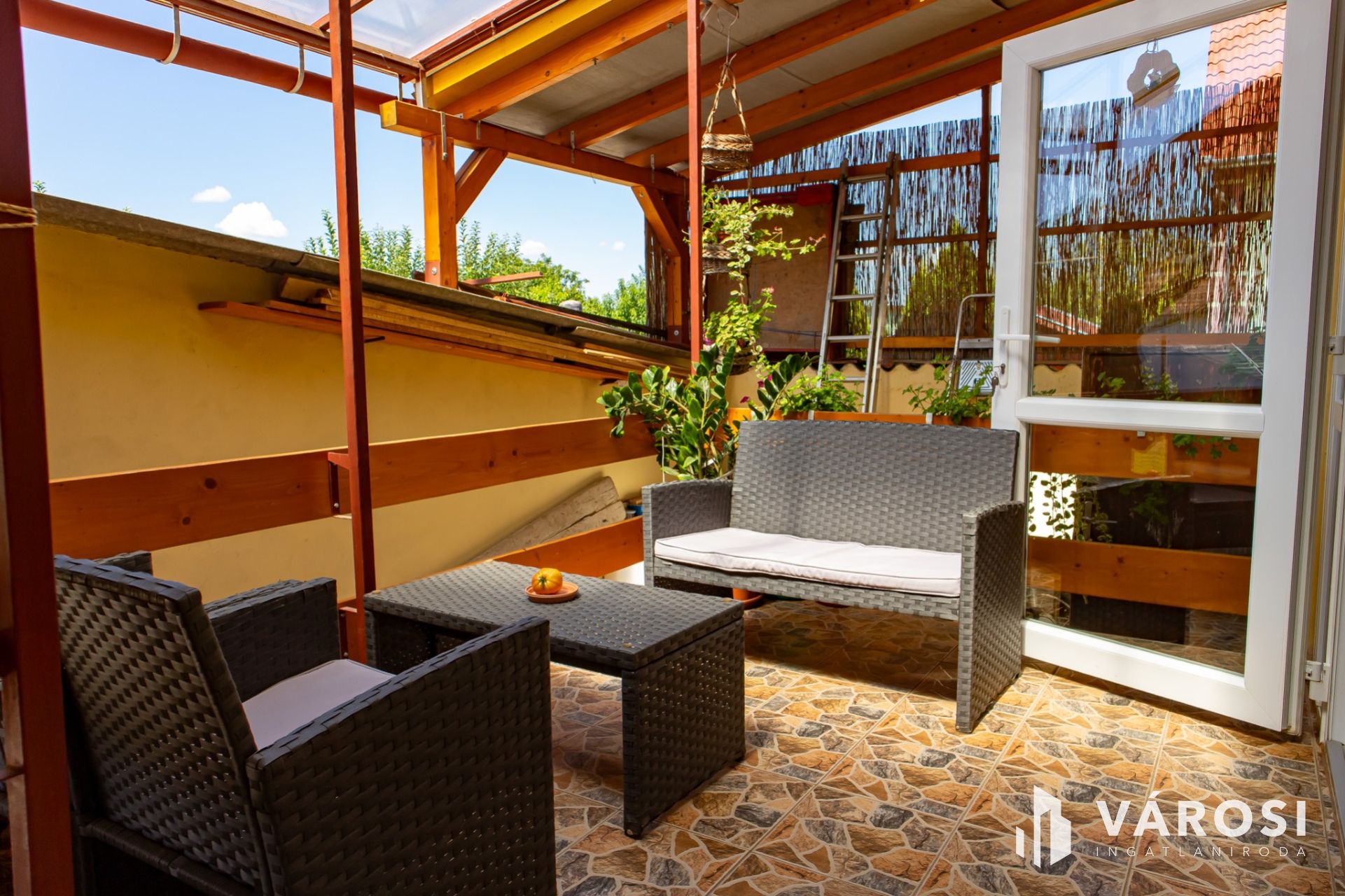 The house occupies the NE part of the 604 m2 plot with an internal floor area of ​​approx. 90 m2. The house has 2 entrances, a few steps lead up to the main entrance, the entrance accessible from the yard can be reached via a lower seating area and a pleasant covered terrace. From the 7.5 m2 terrace we can see the yard and the garden.