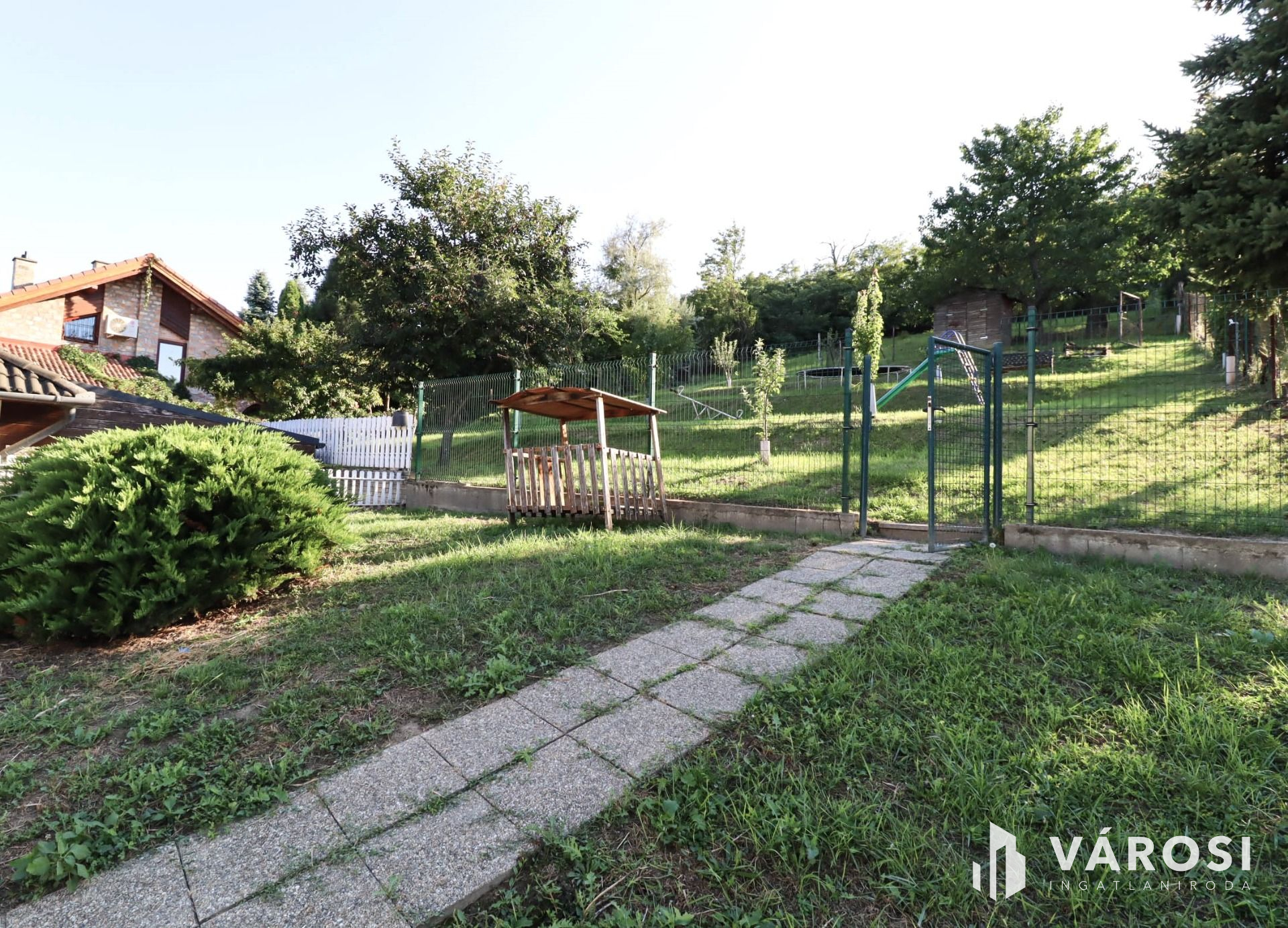 A 2 garázs mellett térkövezett parkolási lehetőség, gyerekeknek 2 kialakított játszótér, az udvar hátsó fele füvesített, dísznövényekkel, tujákkal, gyümölcsfákkal árnyékolt.