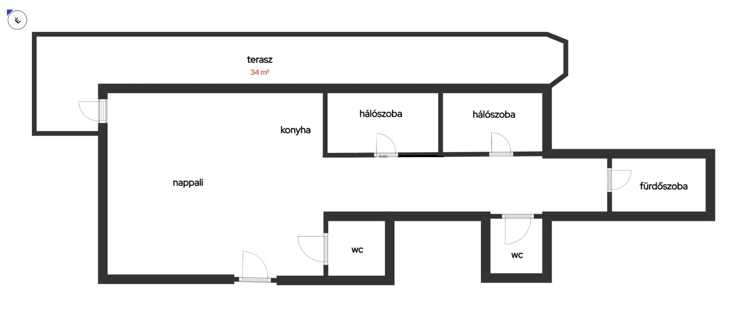 A 34 m²-es, nagyméretű terasz igazi különlegesség, amely mindhárom szobából megközelíthető, és kényelmesen berendezett – tökéletes helyszín pihenéshez vagy akár vendégek fogadásához.