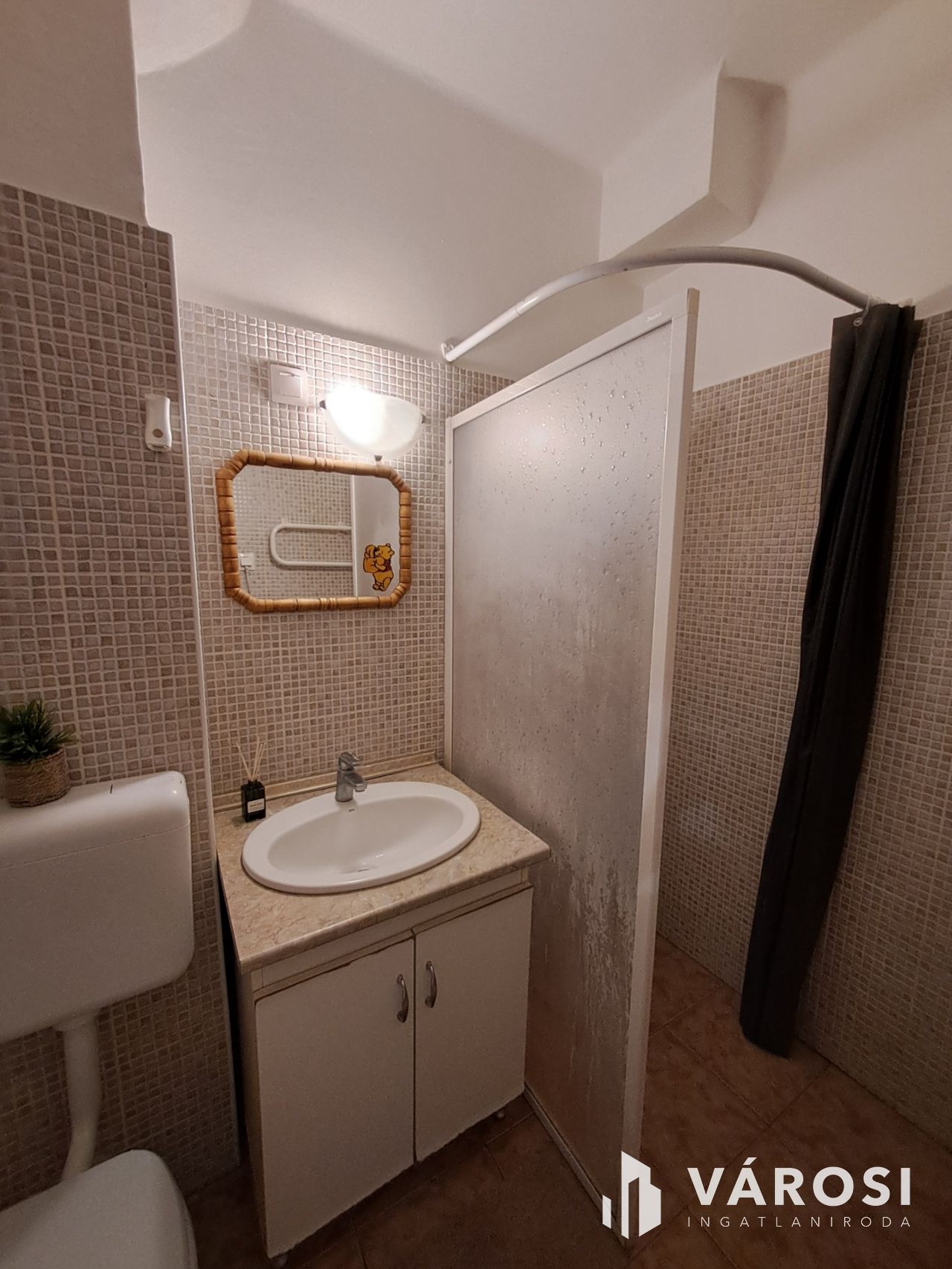 A fürdőszoba és a wc egyben van, egy nagyobb zuhanyzó is helyet kapott.