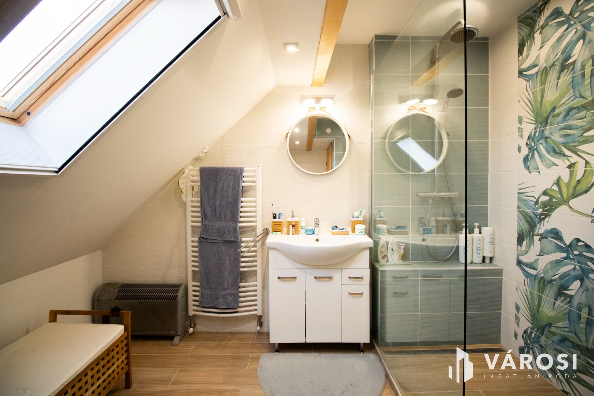 A tetőtérben további két teljes értékű hálószoba található, valamint egy ízléses, épített zuhanyzós gyönyörű fürdőszoba és egy gardrób.