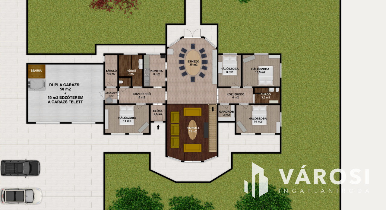 A lenti szinten továbbá 4 db hálószoba és 2 db fürdőszoba biztosítja a kényelmet, valamint a nyugodt pihenést a család összes tagjának. A padlófűtéses, 50 m2-es dupla garázsból pedig minden nap kellemes lesz a reggeli elindulás.