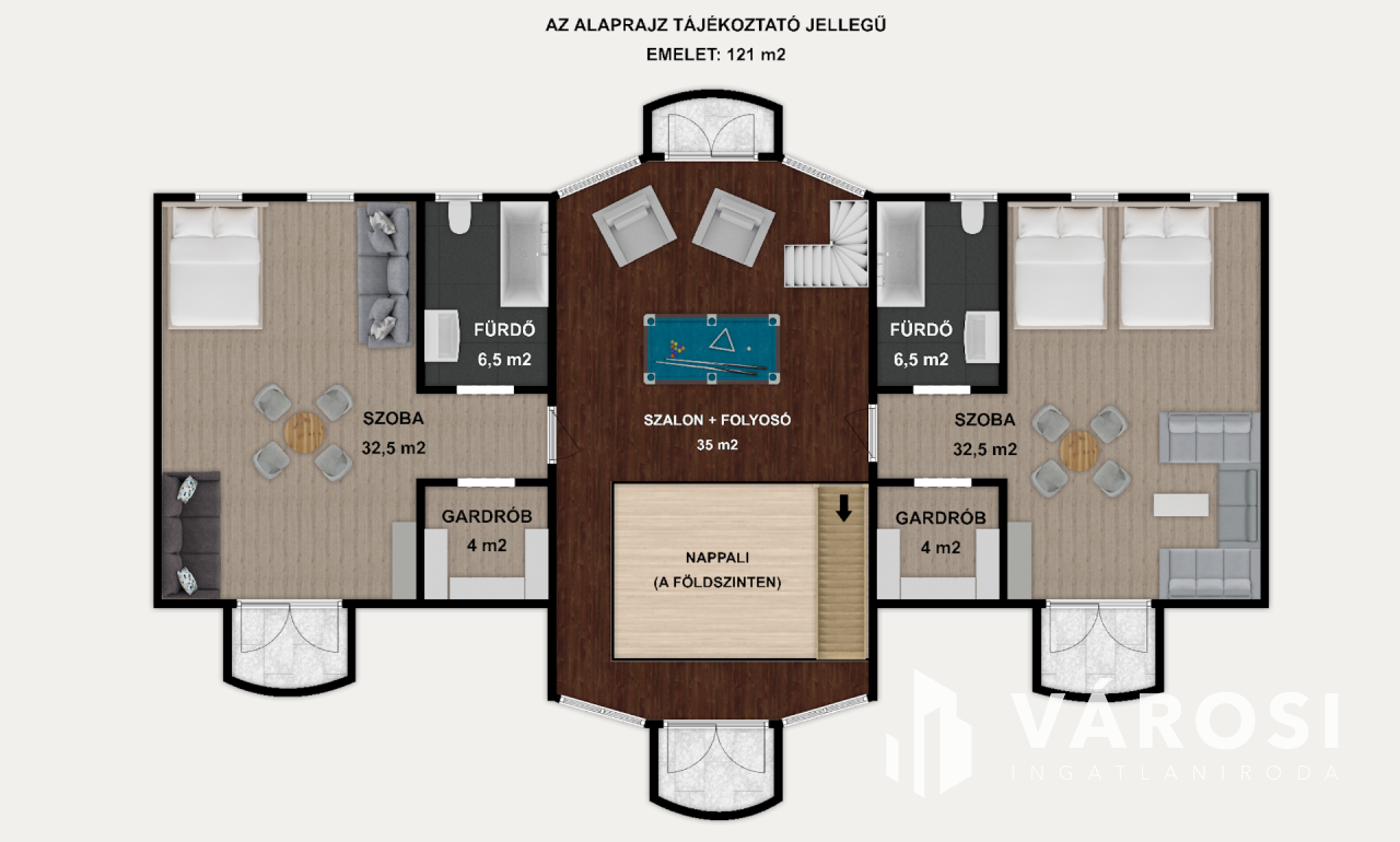 32,5 m2-es szoba, saját 6,5 fürdővel és 4 m2-es gardróbbal.