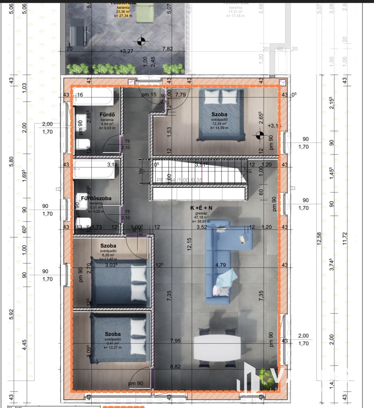 - Homlokzati hőszigetelés: 12 cm dryvit rendszer