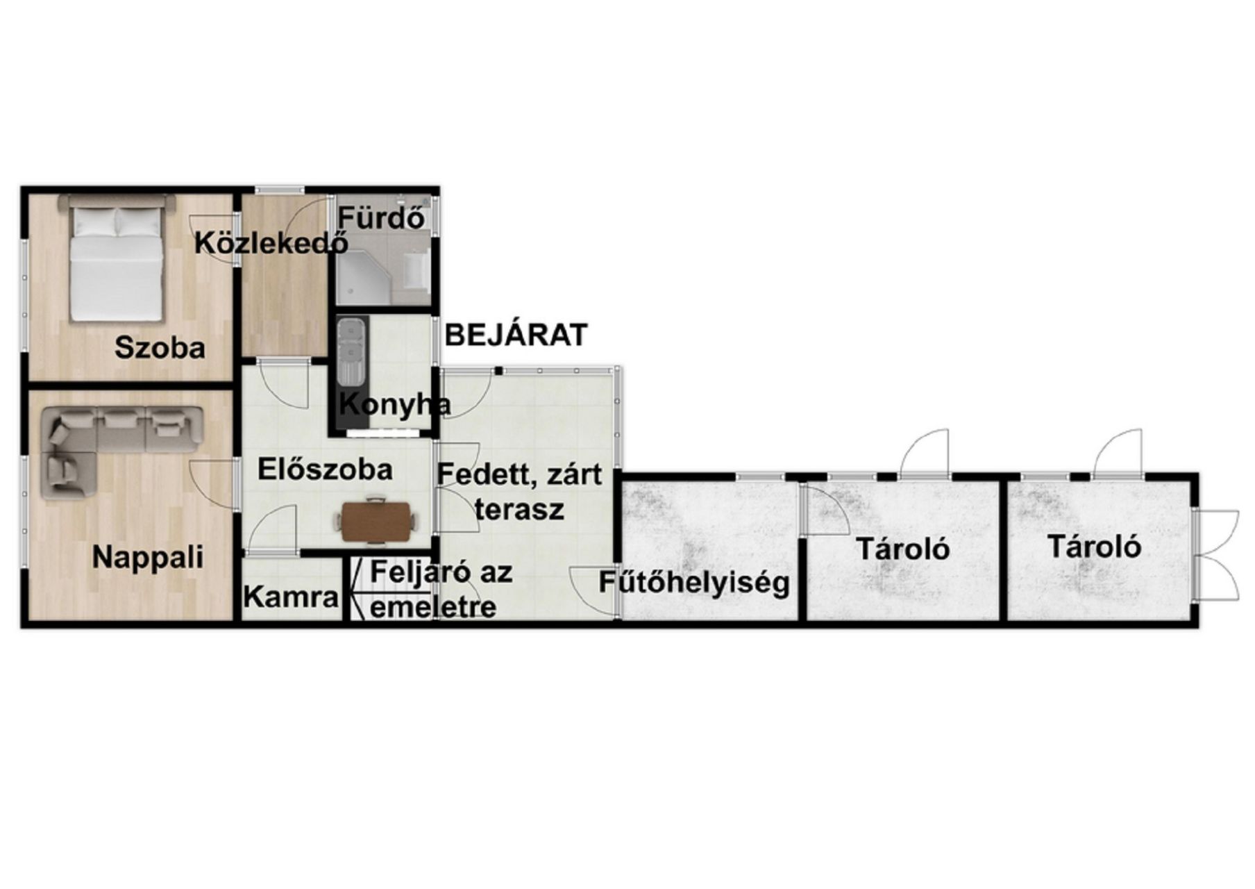 A családi ház fűtése kombicirkóval történik mely egy különálló helyiségben található. A beépytett terasz alatt közel 4nm-es pince mely ideális gyümölcsök és zöldségek tárolására.