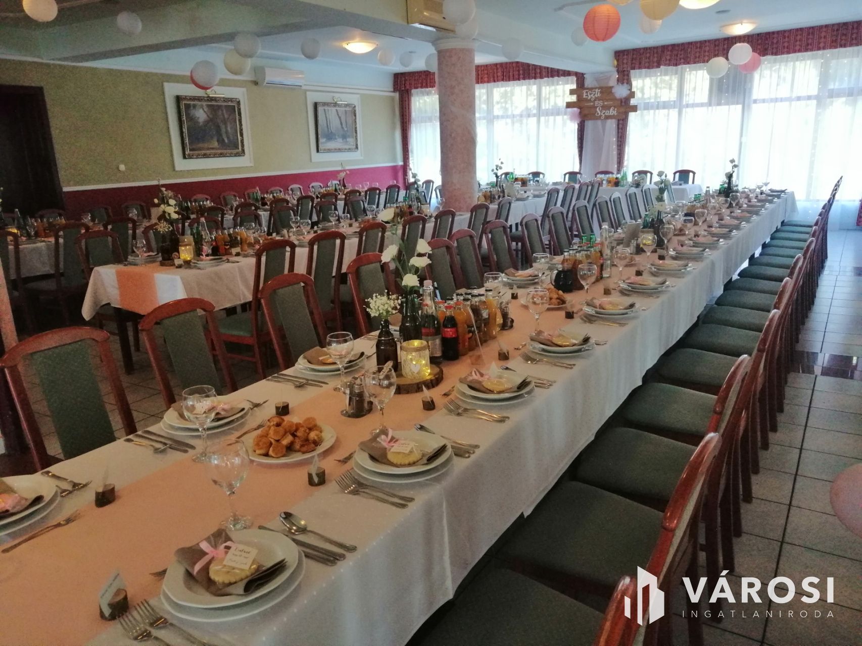 Nagykanizsától pár percre gépkocsival, közvetlen nagy forgalmú fő út szomszédságában vált eladóvá ez a lehetőségekkel teli vendéglátó egység. Funkcionálisan használható kisebb-nagyobb rendezvények lebonyolítására, (lakodalom, születésnapok, céges rendezvények..stb) valamint akár a lokációjának köszönhetően melegkonyhás étteremként és panzióként is üzemeltethető. Étterem rész befogadó képesége 180 fő, a terasz pedig további 100 fő vendég leültetésére alkalmas. A felső szinten található szobák pedig maximum 30 fő ott alvására lett kialakítva. Maga az épület beton alappal, tégla falazattal, cserép tetőfedéssel került megépítésre a 2000-es évben. Az ingatlanhoz érve léphetünk be egy közel 170m2-es fedett teraszra, ahonnan a főbejárati ajtón áthaladva érkezünk az épület központi részébe, mely 251m2-es nagyságának köszönhetően akár étterem akár rendezvényteremként is használható. Ezen légtérből megközelíthető meg a felső szint is ahol 10 külön bejáratú szoba saját vizesblokkal került kialakításra, valamint még ezen szinten háztartási helység és iroda is megtalálható. Az ingatlan teljesen klimatizált. (alsó szint, felső szint minden szoba külön-külön). Az alsó szintre visszatérve található még egy női és egy férfi illemhelység, egy nagy konyha a hozzá tartozó helységekkel és tárólokkal, hűtőházzal, személyzeti öltözővel. Az éttermi részen a dolgozok munkáját segíti, egy igényes nagy italpultrendszer is melyhez kis ablakon keresztük konyhakapcsolat is tartozik. Az ingatlan fűtése egyedi gáz cirkó, mely radiátorok és padlófűtésen keresztül szolgáltatja a meleget.
