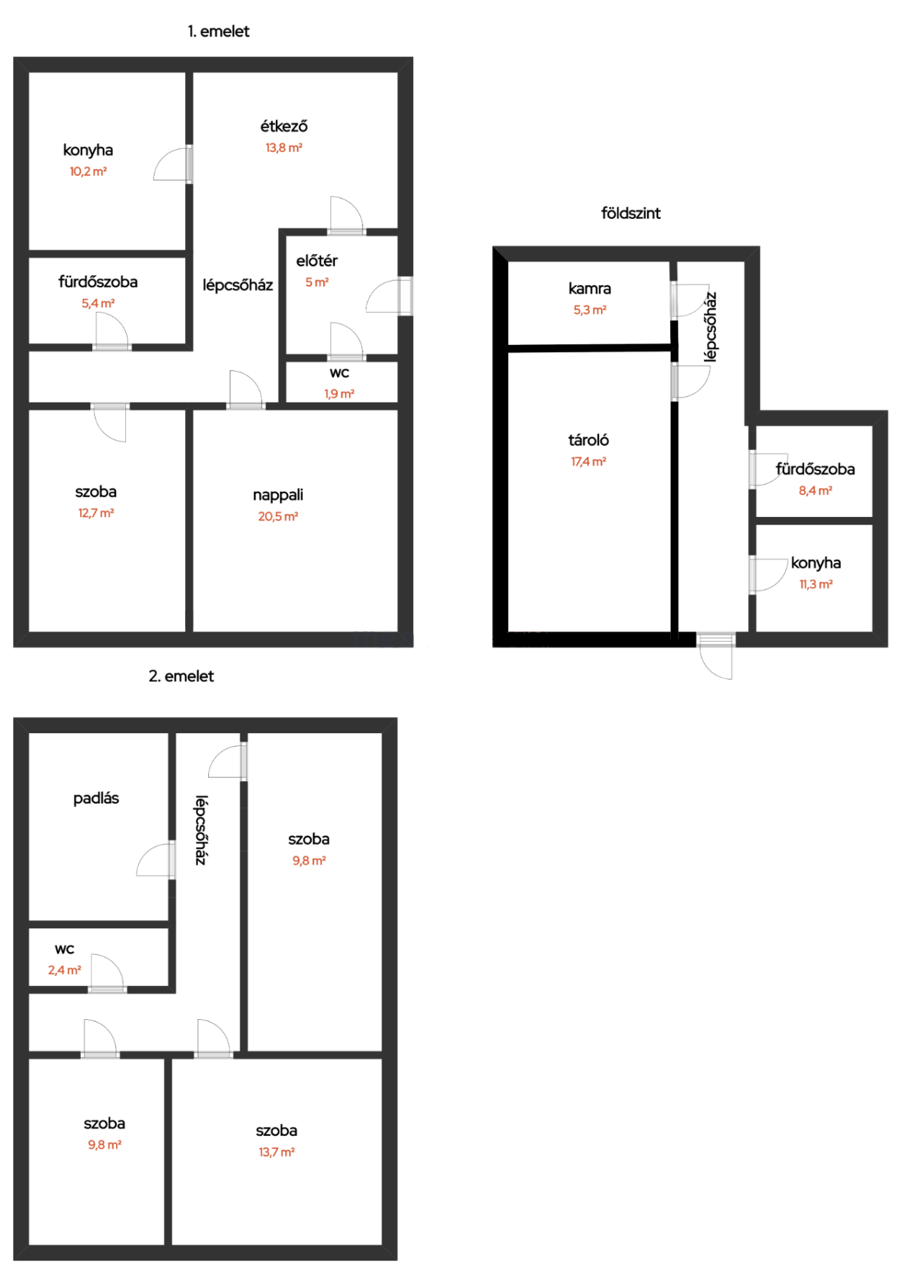 Két fürdőszoba: az alsó szinten kádas fürdő + WC, az emeleten külön fürdő és WC