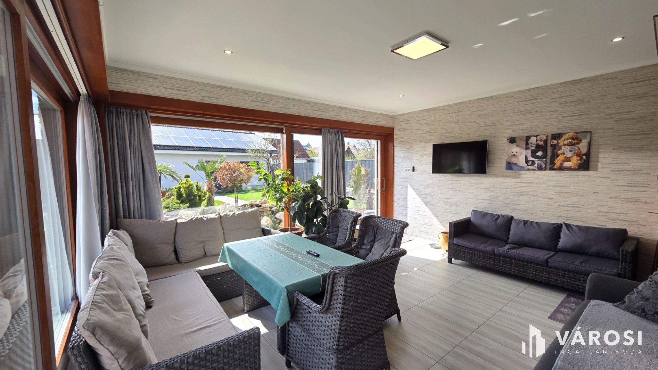 ☀️ Fényárban úszó nappali: A nappali közvetlenül a hatalmas üvegfelületekkel rendelkező télikerthez kapcsolódik, így a kert látványa a mindennapok része.