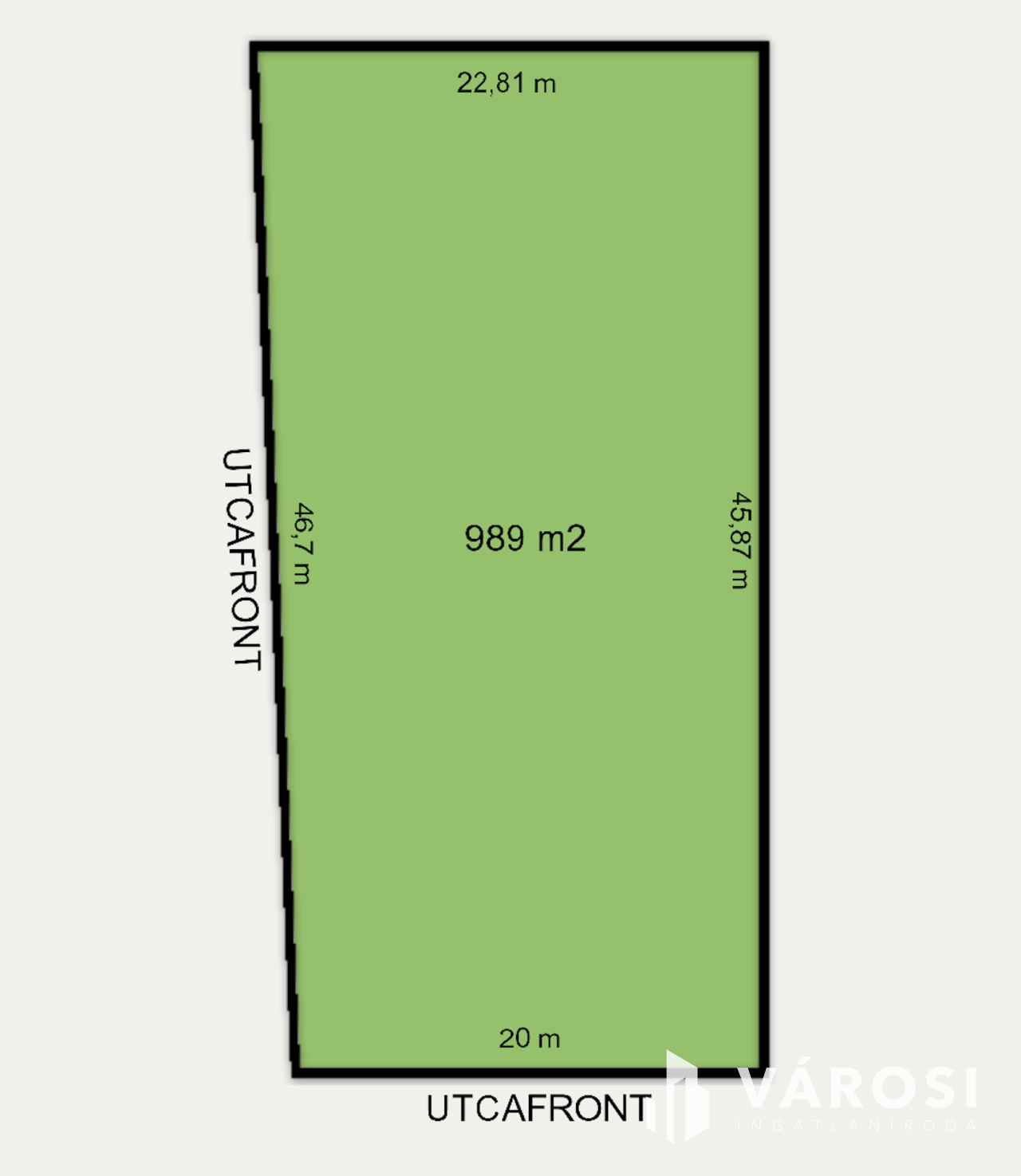A hirdetésben szereplő sarki telek 989 m2, kiválóan alkalmas ikerház építésére is, mivel két utcafronttal rendelkezik.